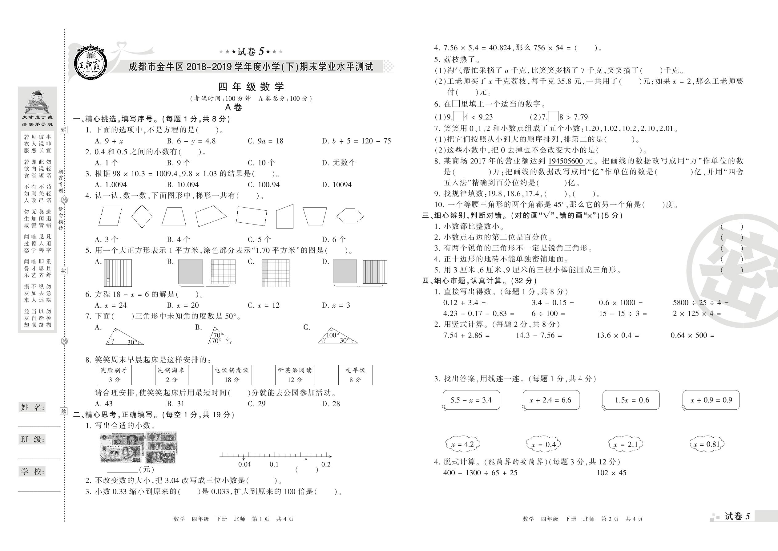 2018-2019学年第二学期成都市金牛区四年级数学试卷(北师版)【5】