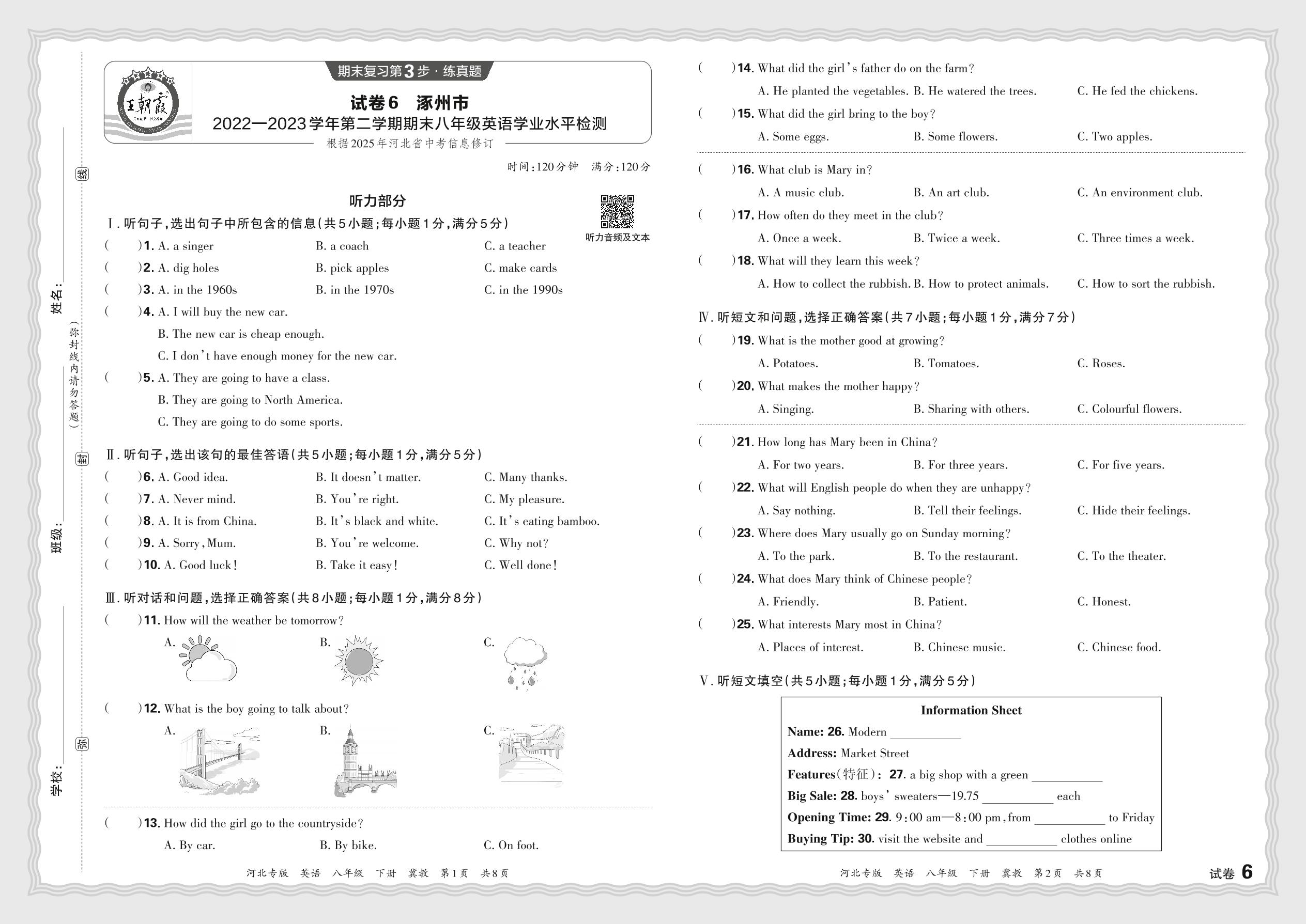 河北省保定市涿州市2022-2023学年第二学期期末八年级英语学业水平检测(冀教版)【6】