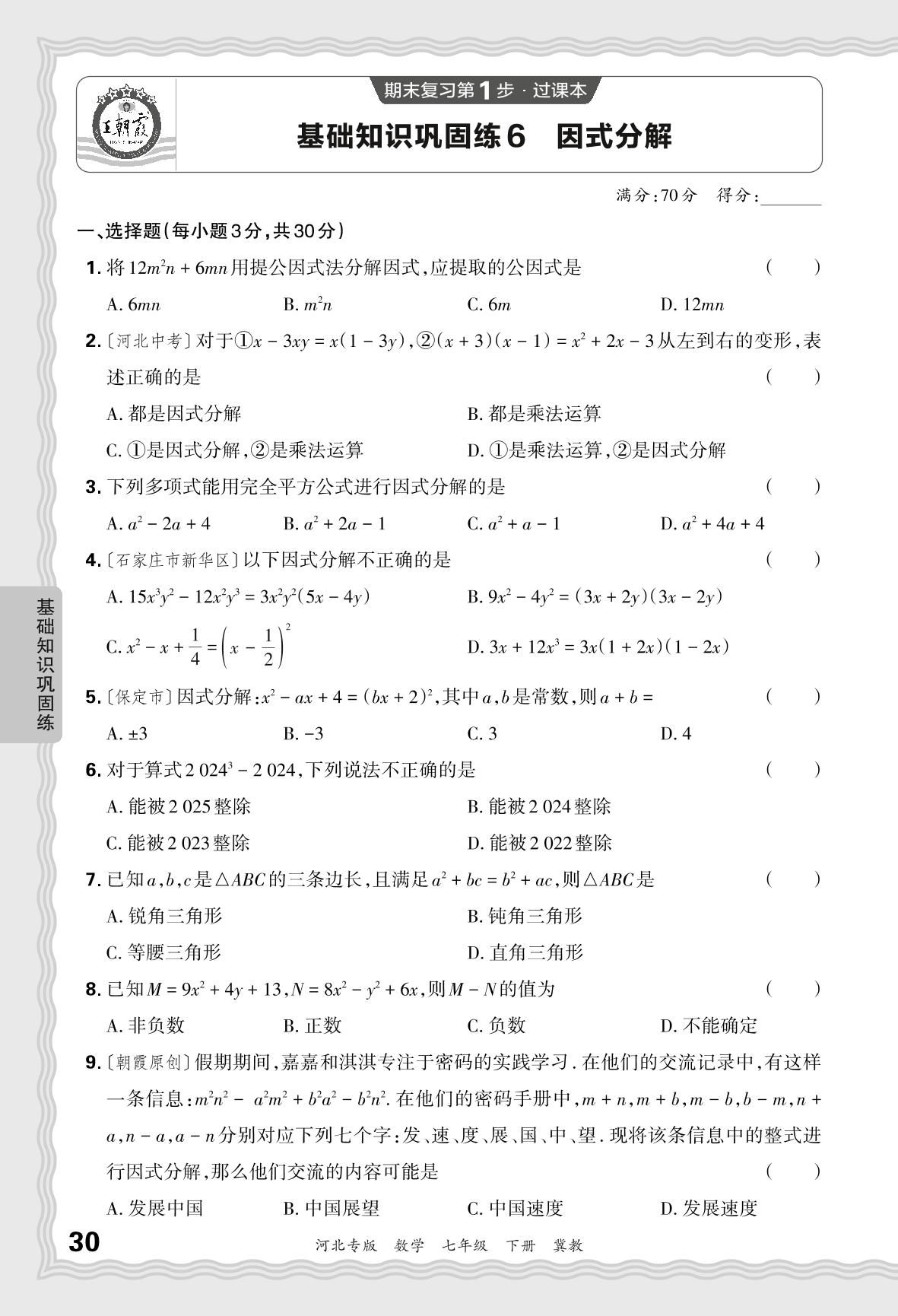 2024春下册七年级数学冀教版 期末过课本河北版·基础知识巩固练 因式分解【6】