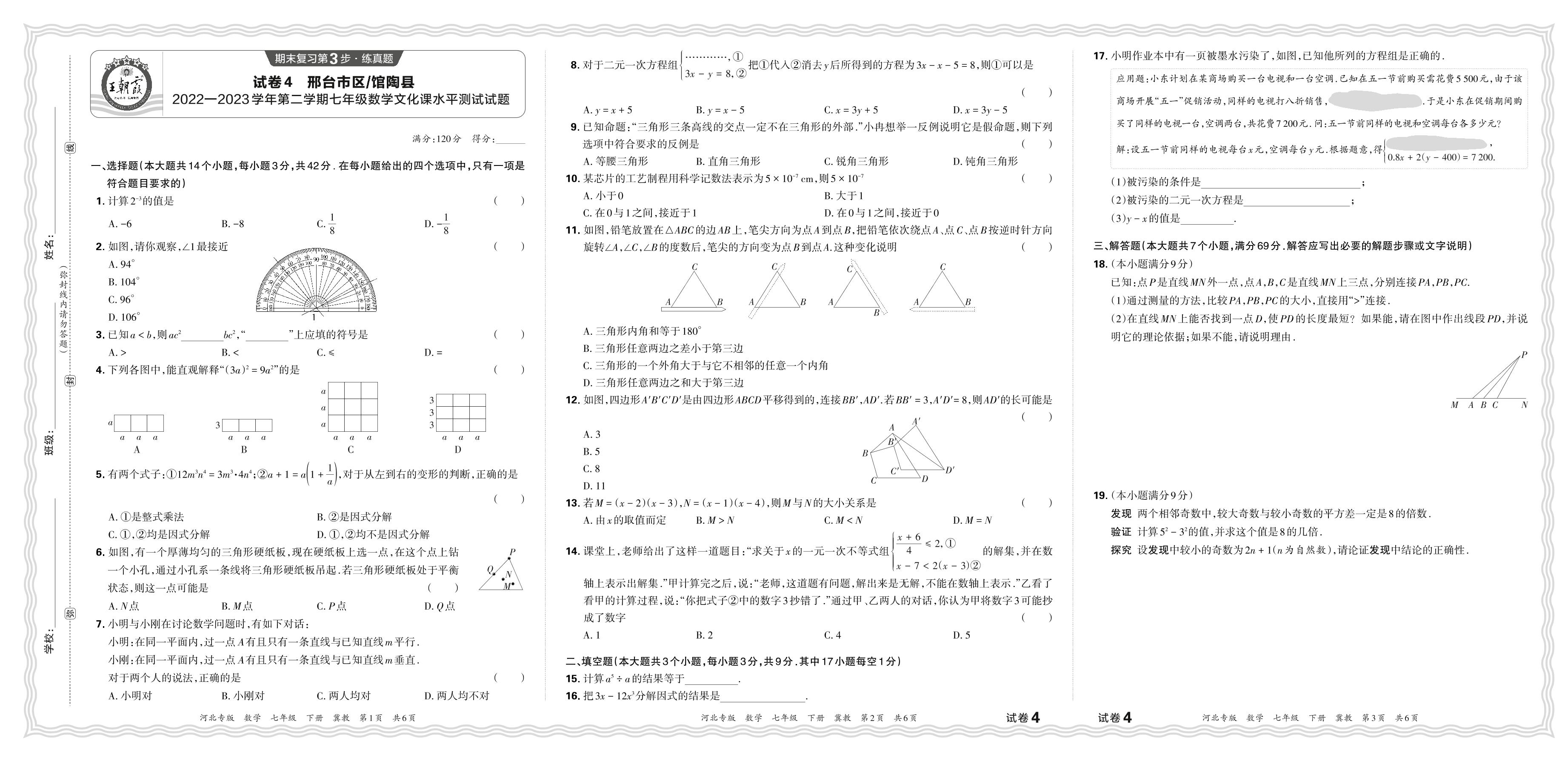 河北省邢台市区、邯郸市馆陶县2022-2023学年第二学期七年级数学文化课水平测试试题(冀教版)【4】
