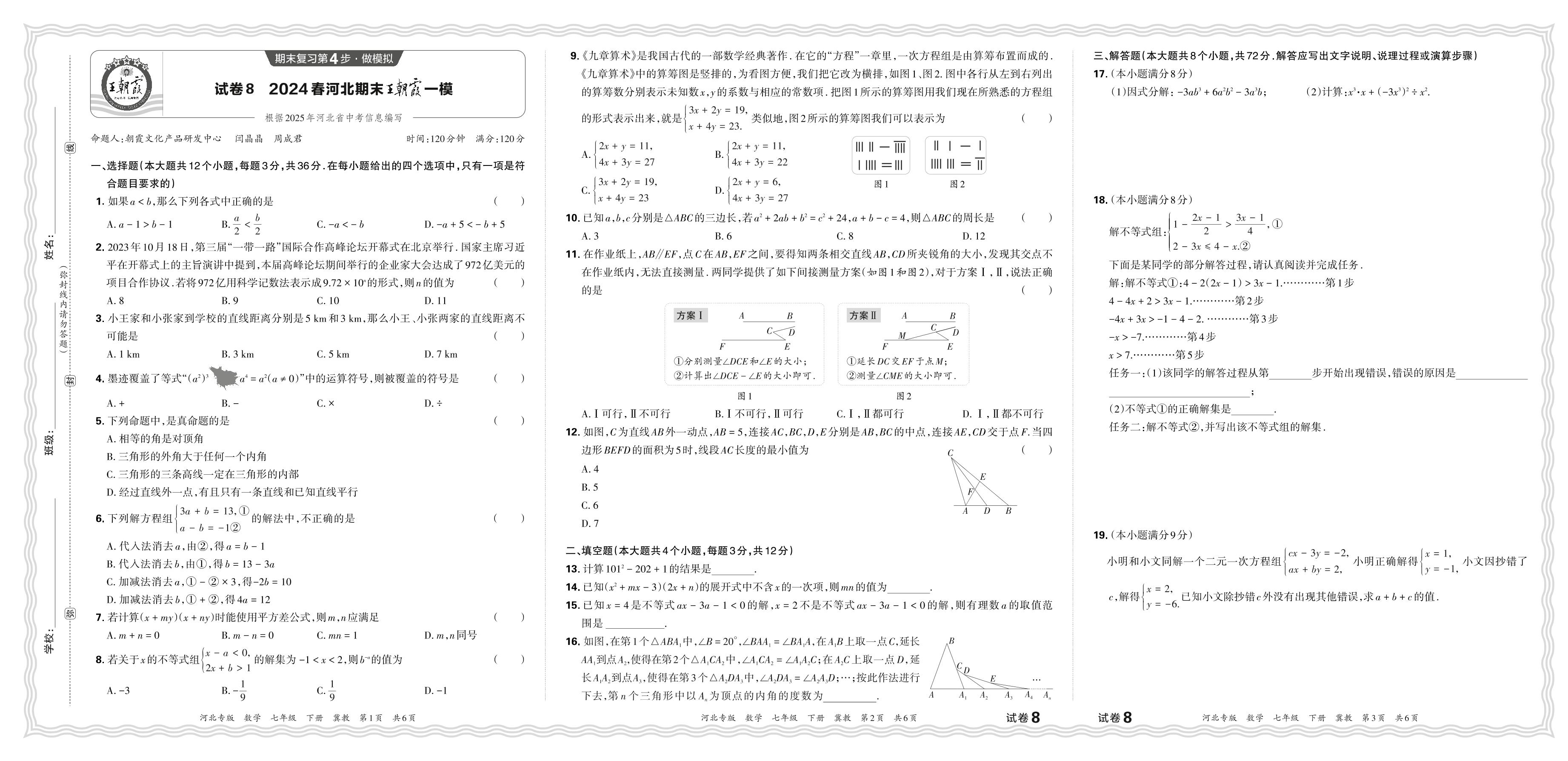 2024春下册七年级数学冀教版 河北期末王朝霞一模【8】