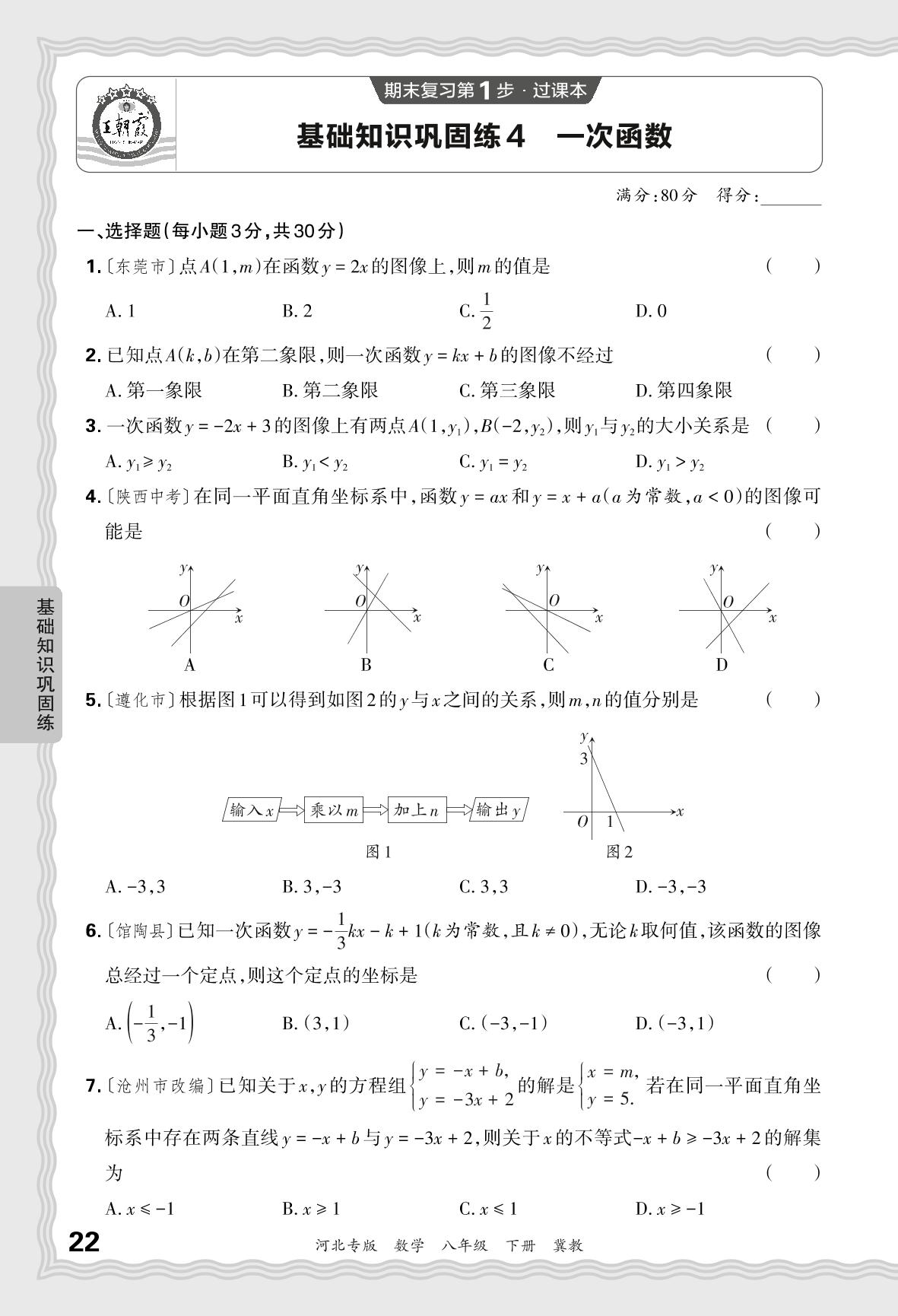 2024春下册八年级数学冀教版 期末过课本河北版·基础知识巩固练 一次函数【4】