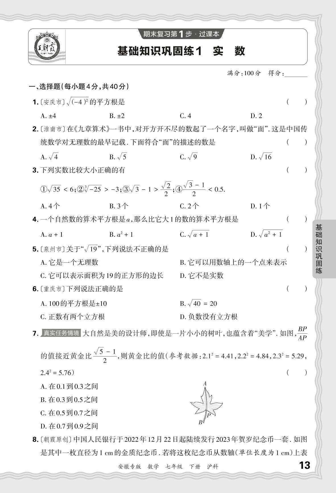 2024春下册七年级数学沪科版 期末过课本安徽版·基础知识巩固练 实数【1】