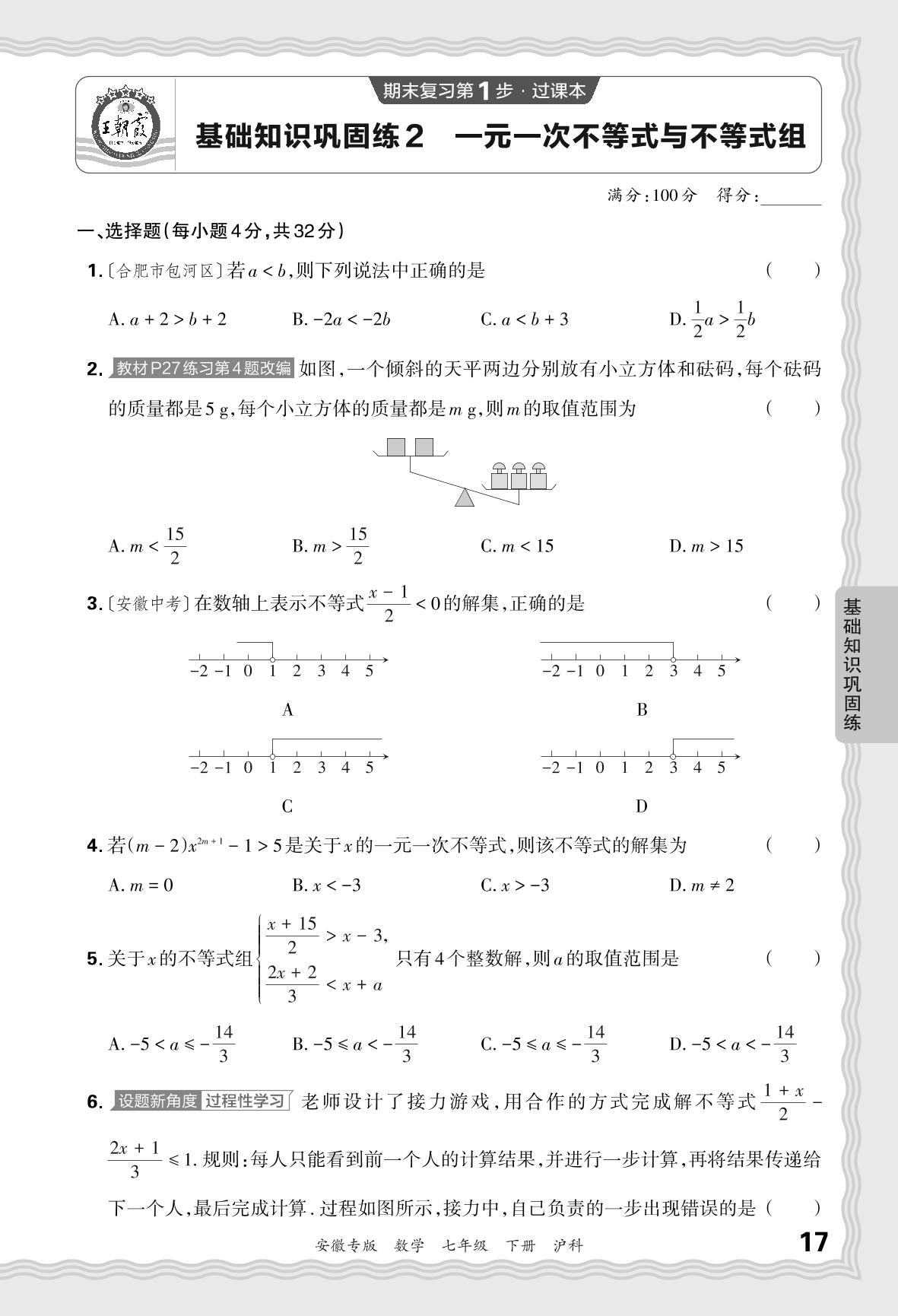 2024春下册七年级数学沪科版 期末过课本安徽版·基础知识巩固练 一元一次不等式与不等式组【2】