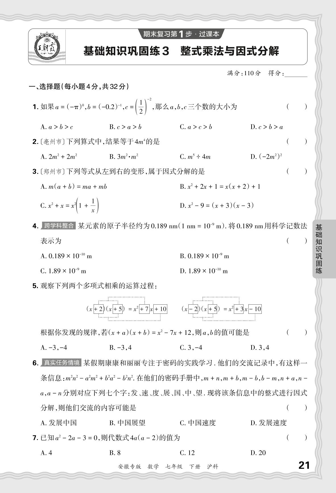 2024春下册七年级数学沪科版 期末过课本安徽版·基础知识巩固练 整式乘法与因式分解【3】