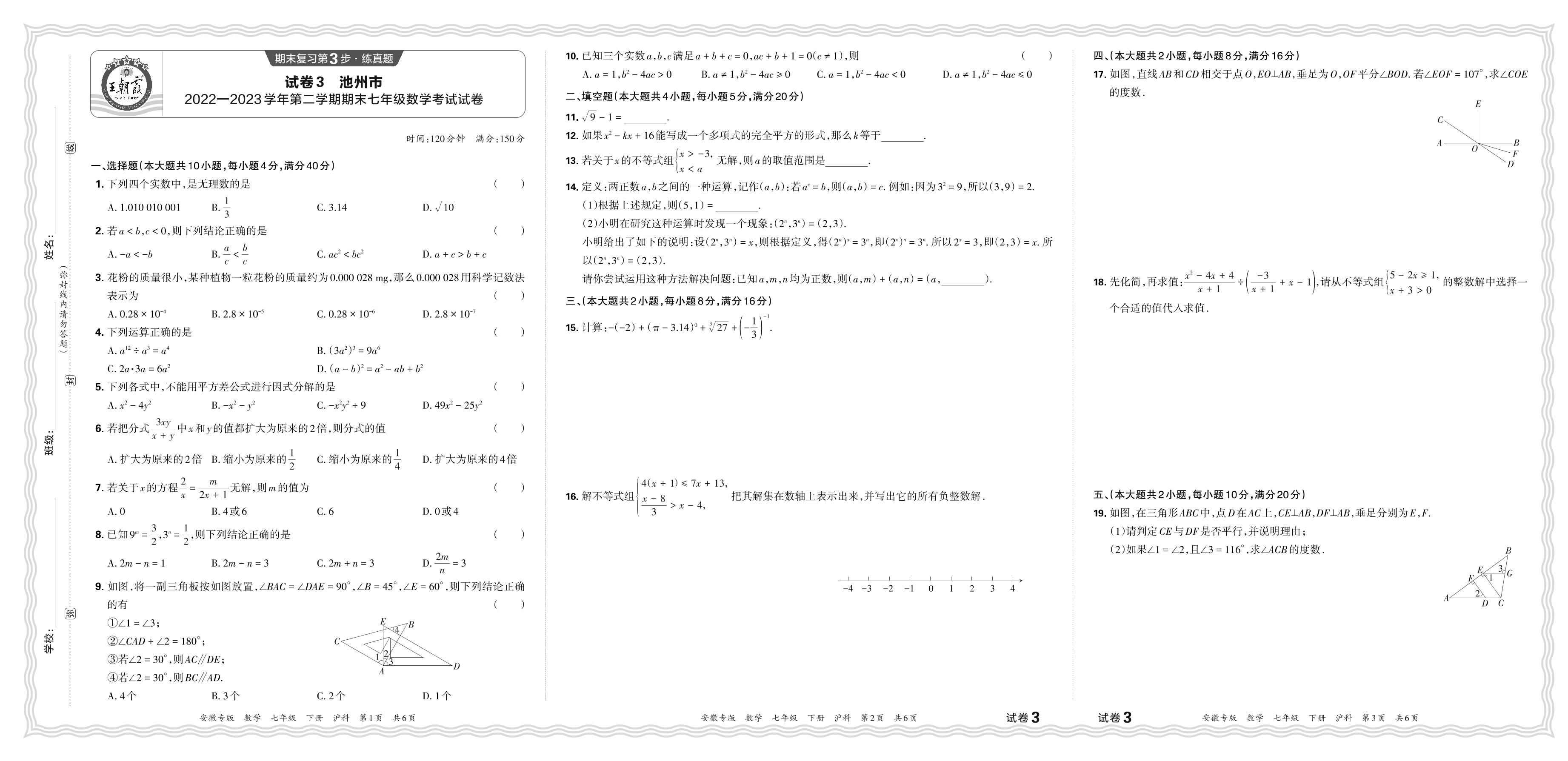 安徽省池州市2022-2023学年第二学期期末七年级数学考试试卷(沪科版)【3】