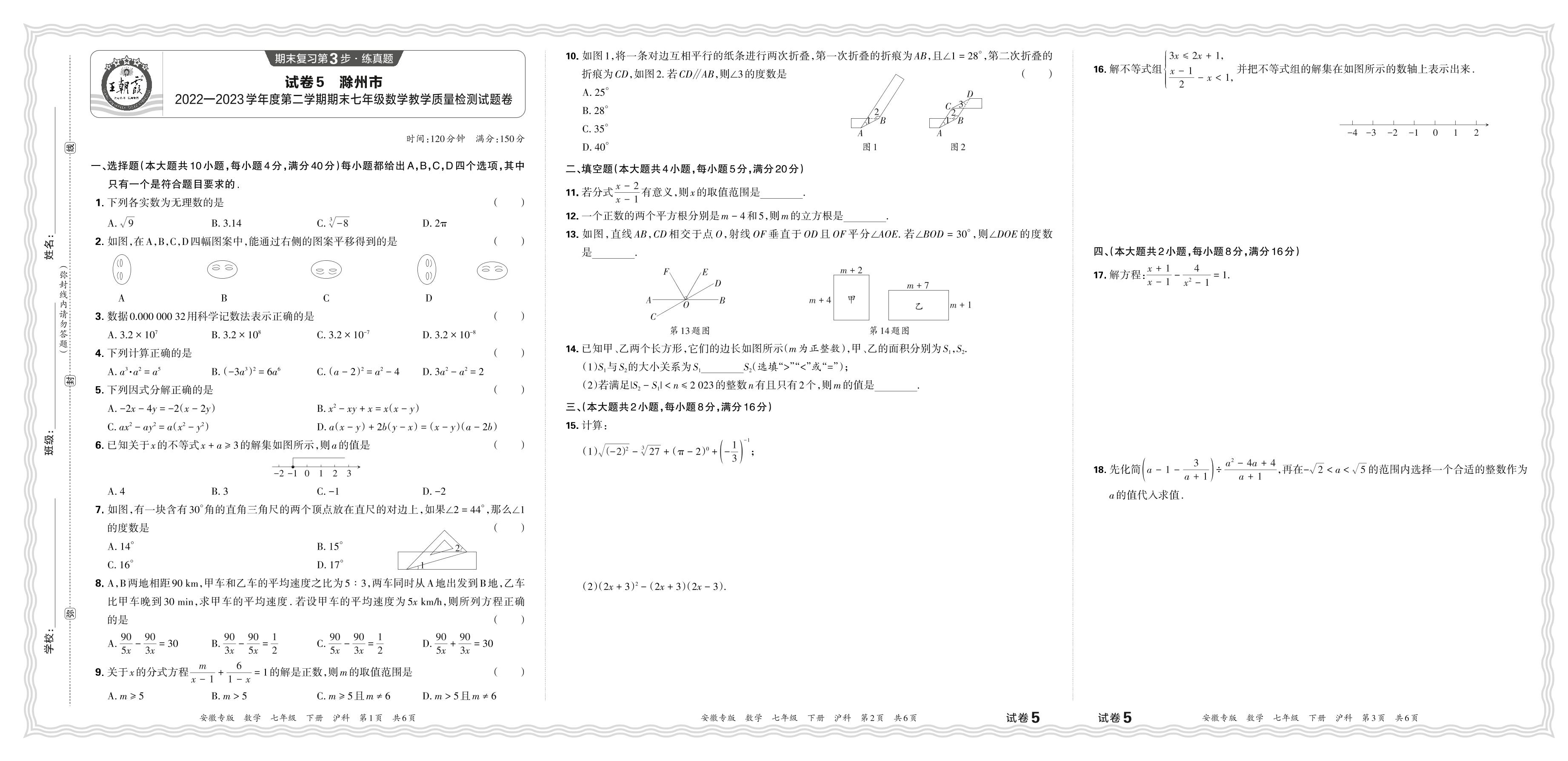安徽省滁州市2022-2023学年度第二学期期末七年级数学教学质量检测试题卷(沪科版)【5】