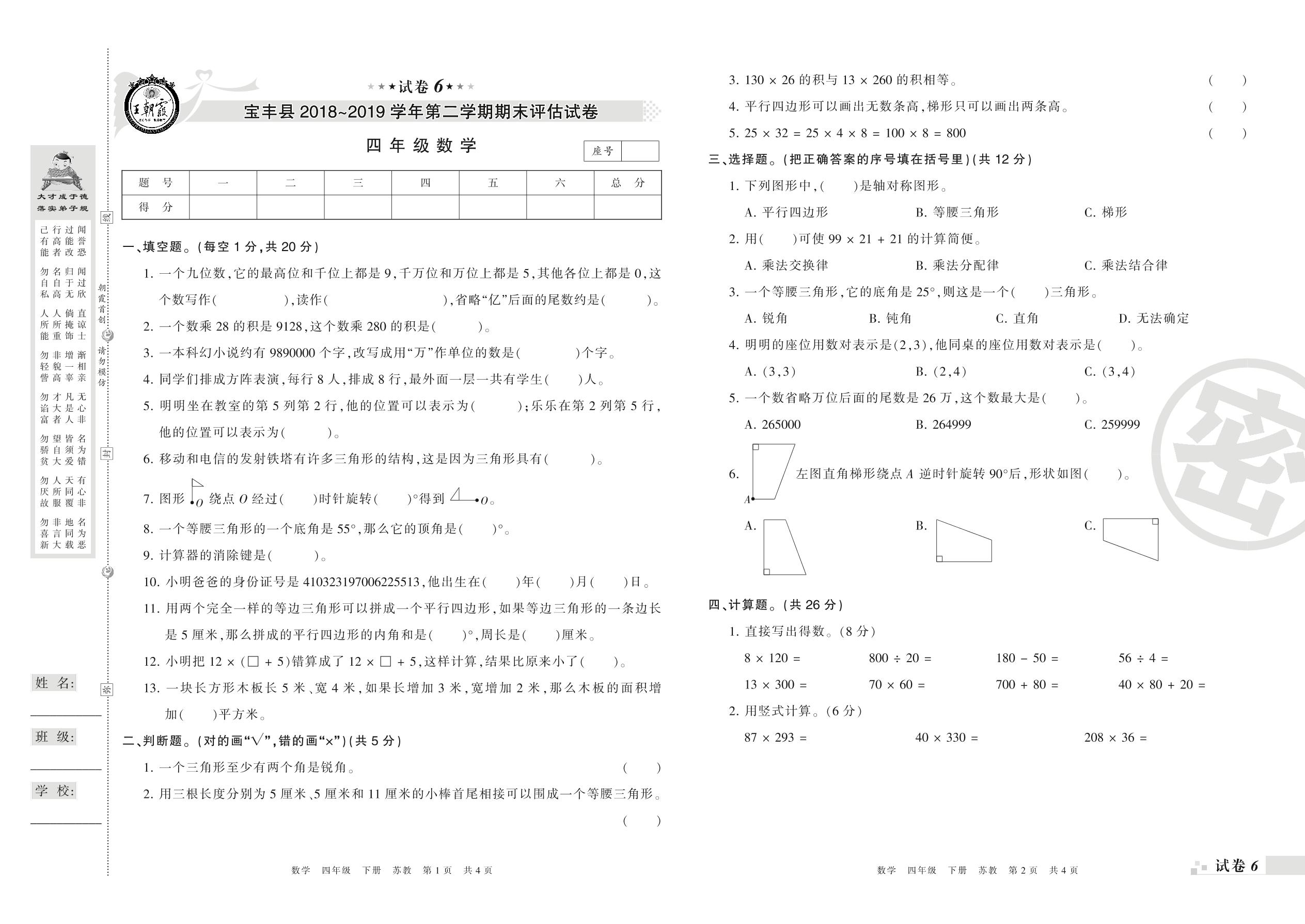 2018-2019学年第二学期平顶山市宝丰县四年级数学试卷(苏教版)【6】