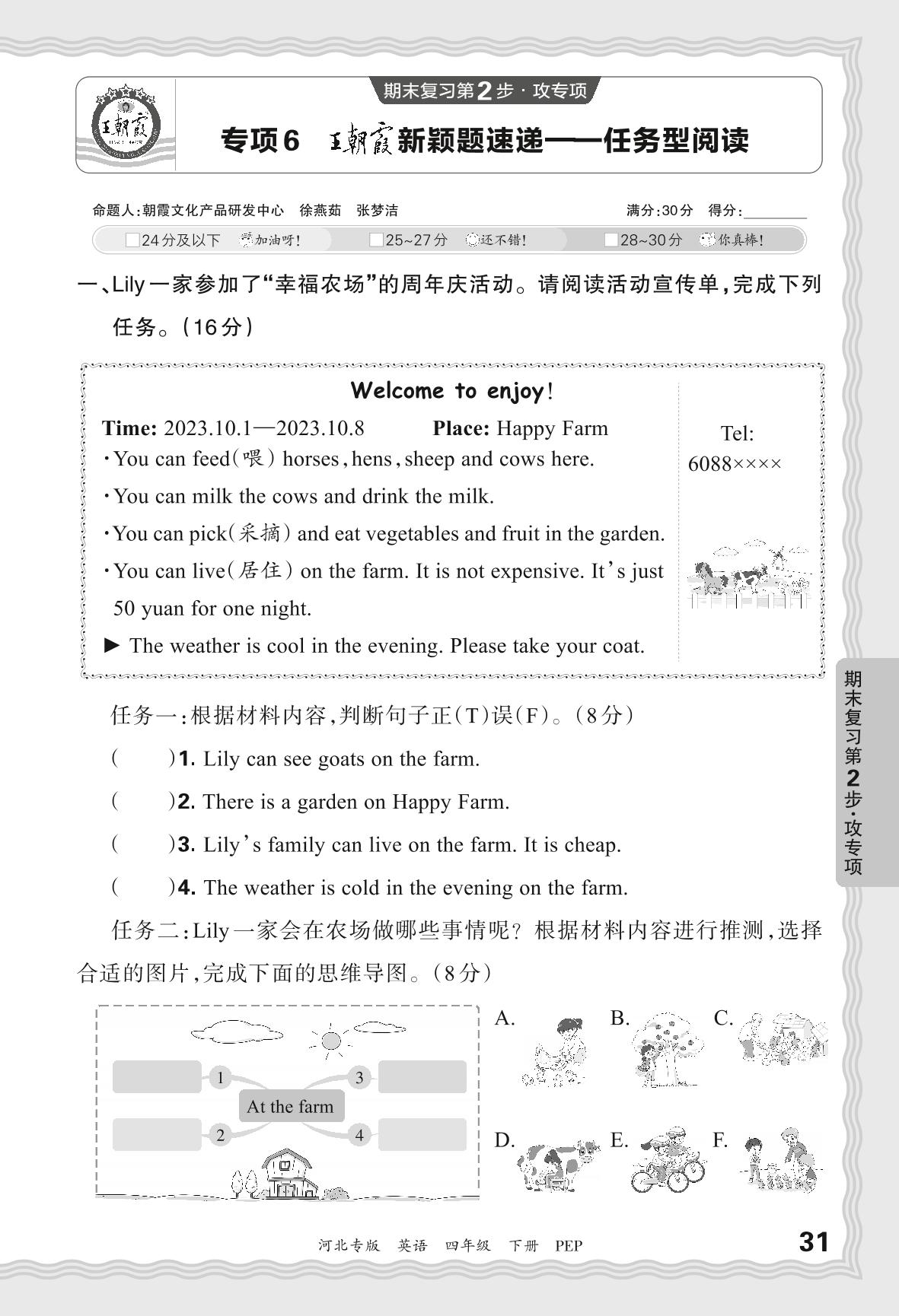 2024春下册四年级英语人教PEP版 期末专项卷河北版·王朝霞新颖题速递——任务型阅读【6】