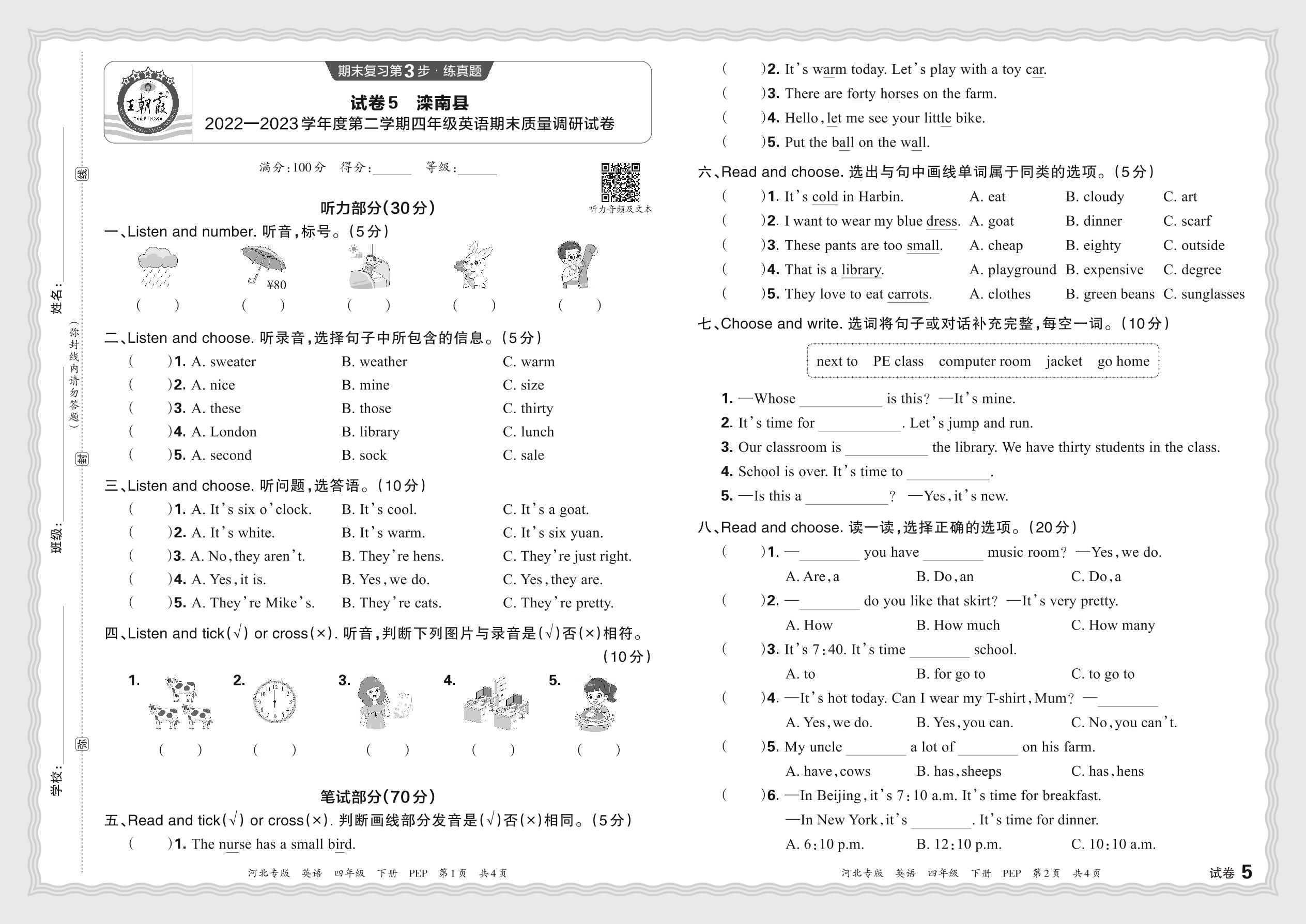 河北省唐山市滦南县2022—2023学年第二学期小学四年级英语期末教学质量调研试卷(人教PEP版)【5】