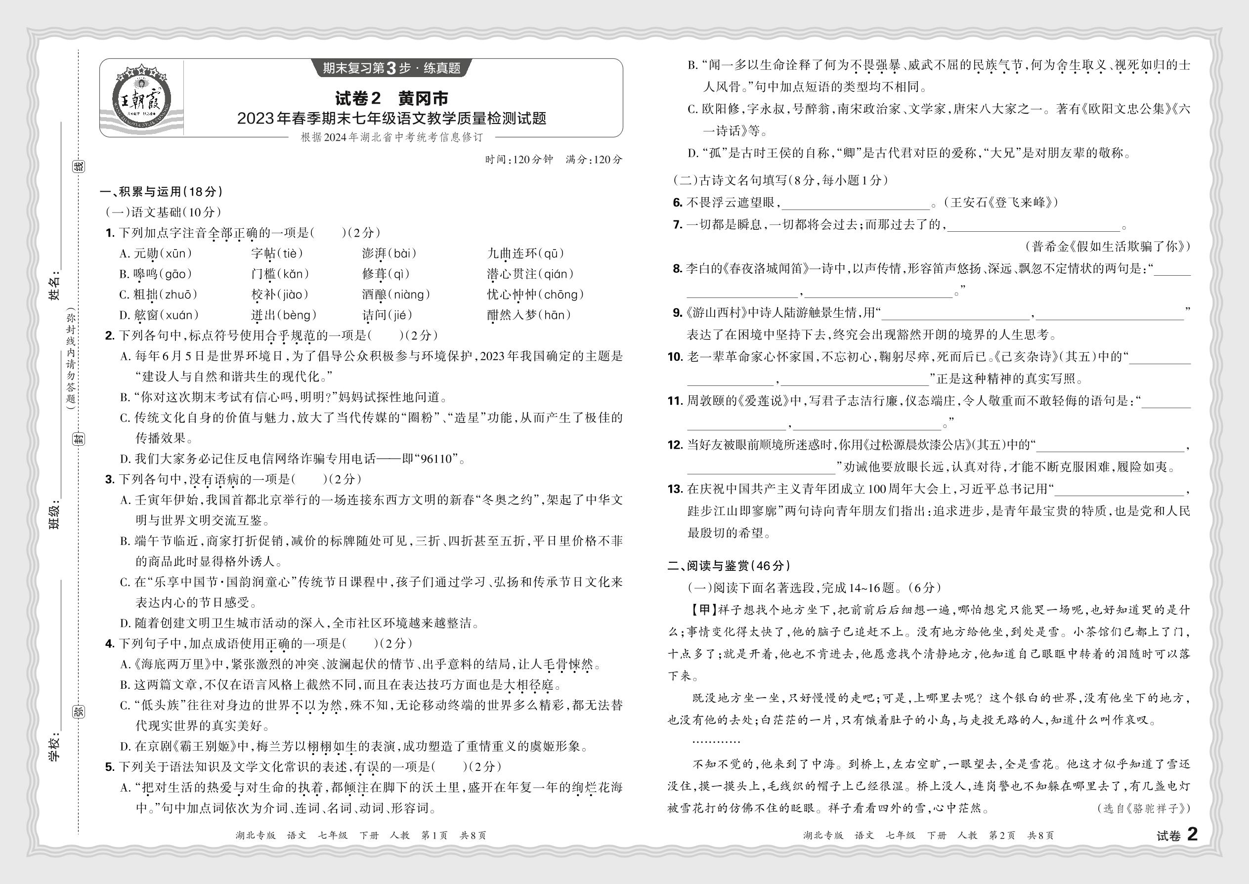 湖北省黄冈市2023年春季期末七年级语文教学质量检测试题(人教版)【2】