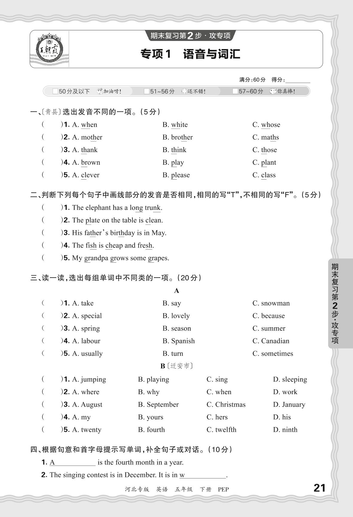 2024春下册五年级英语人教PEP版 期末专项卷河北版·语音与词汇【1】