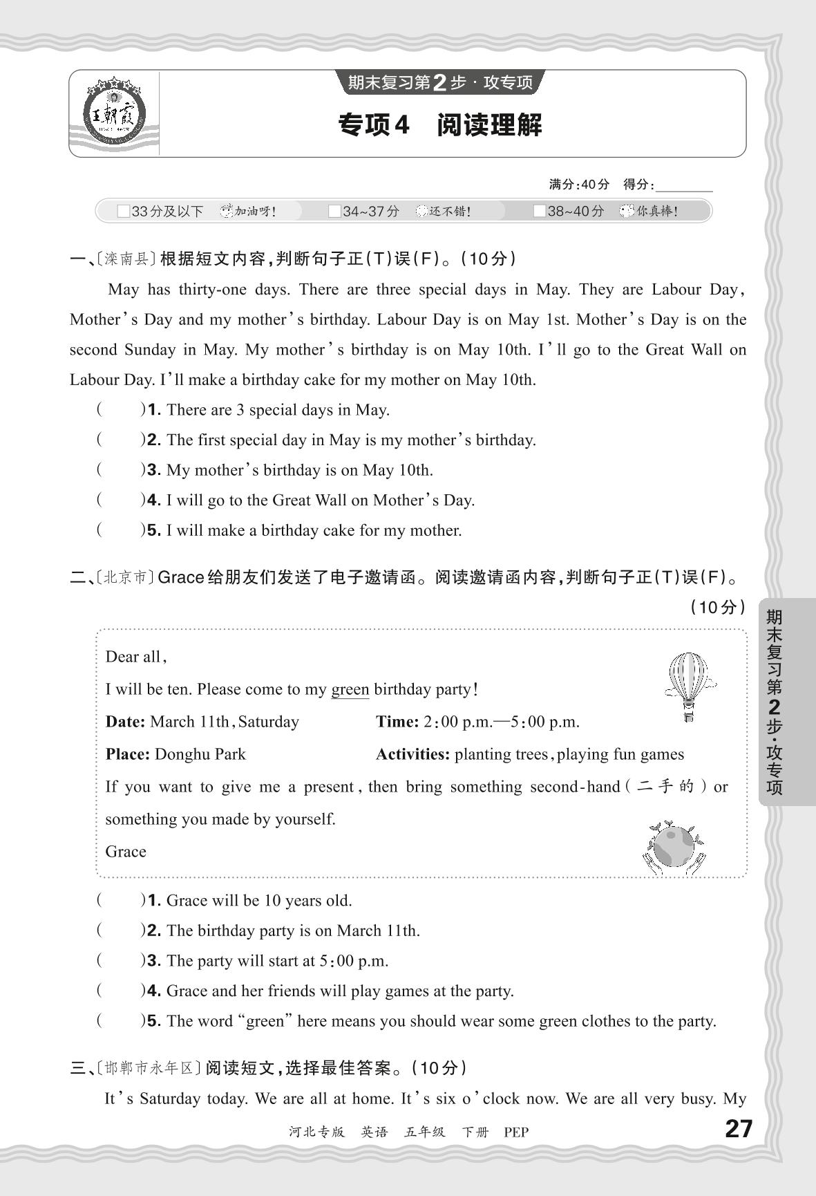 2024春下册五年级英语人教PEP版 期末专项卷河北版·阅读理解【4】