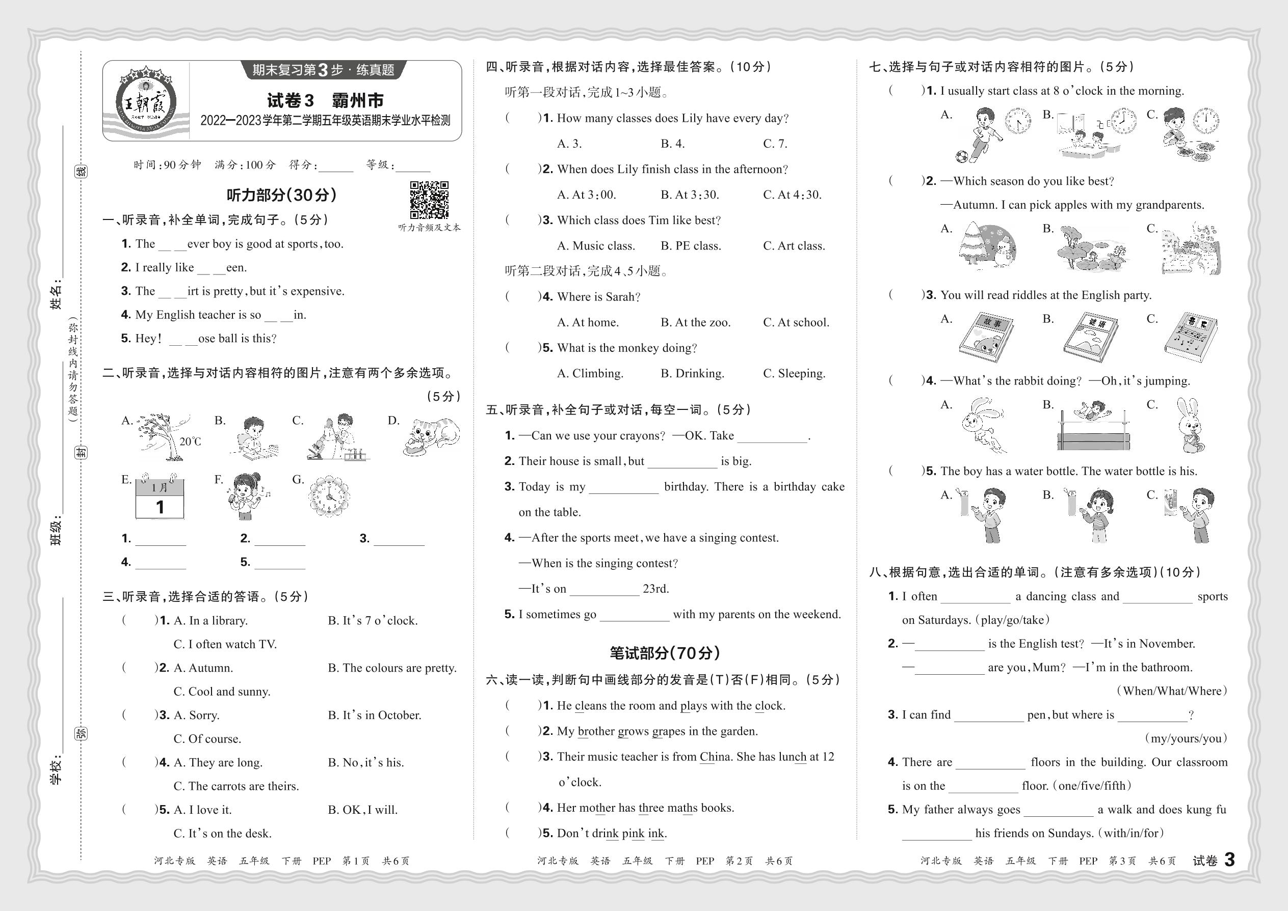 河北省廊坊市霸州市2022—2023学年第二学期五年级英语期末学业水平检测(人教PEP版)【3】