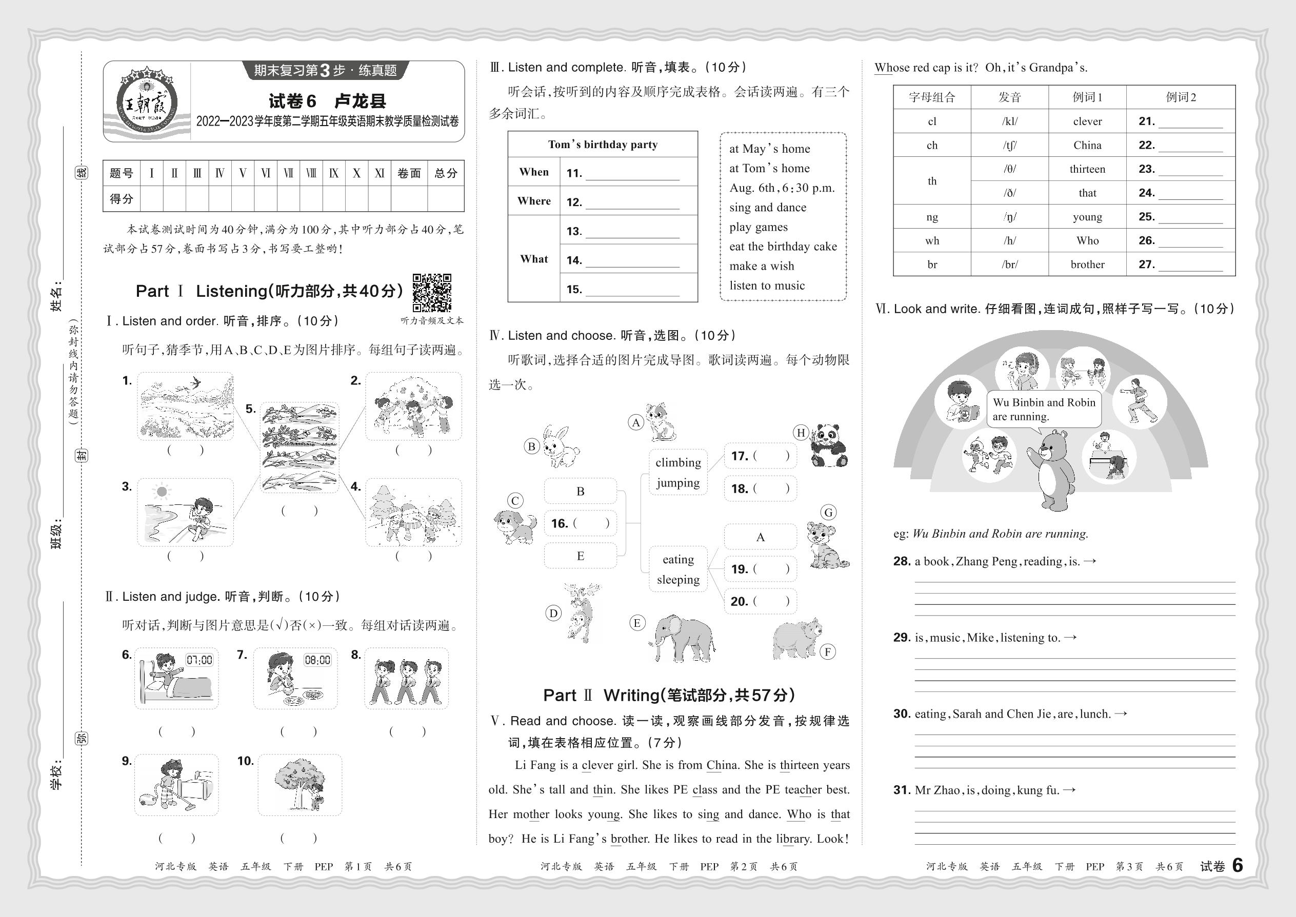 河北省秦皇岛市卢龙县2022—2023学年度第二学期五年级英语期末教学质量检测试卷(人教PEP版)【6】