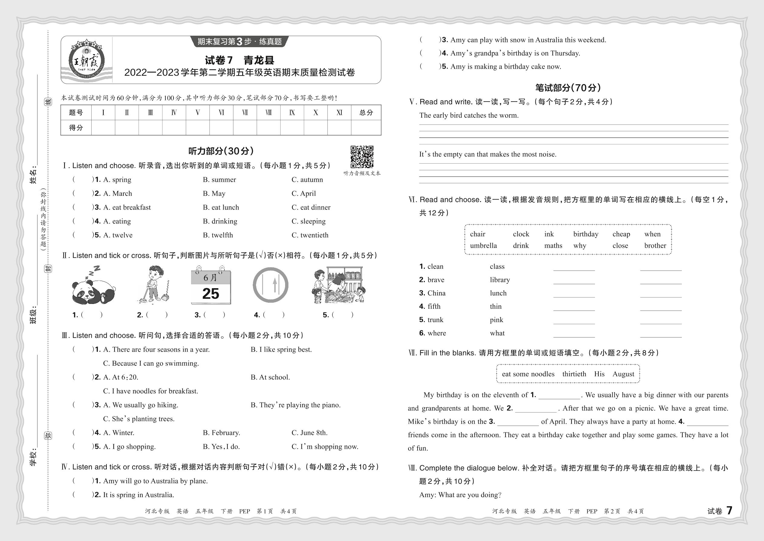 河北省秦皇岛市青龙县2022—2023学年第二学期五年级英语期末质量检测试卷(人教PEP版)【7】