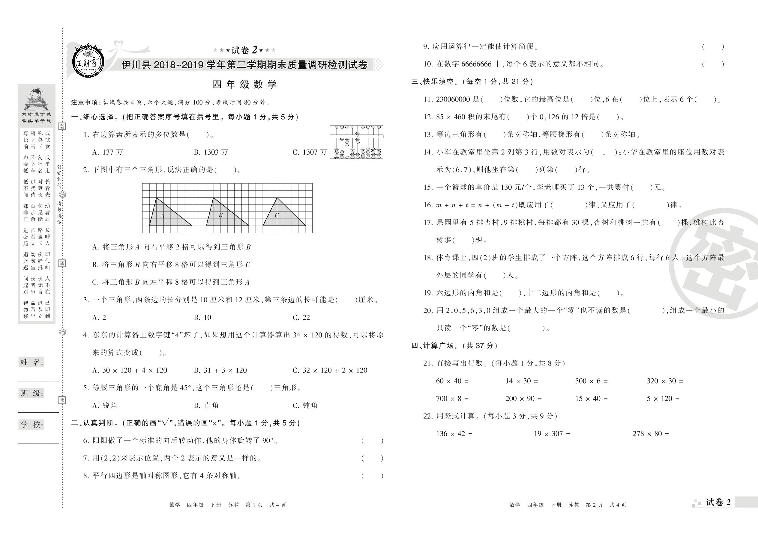 2018-2019学年第二学期洛阳市伊川县四年级数学试卷(苏教版)【2】