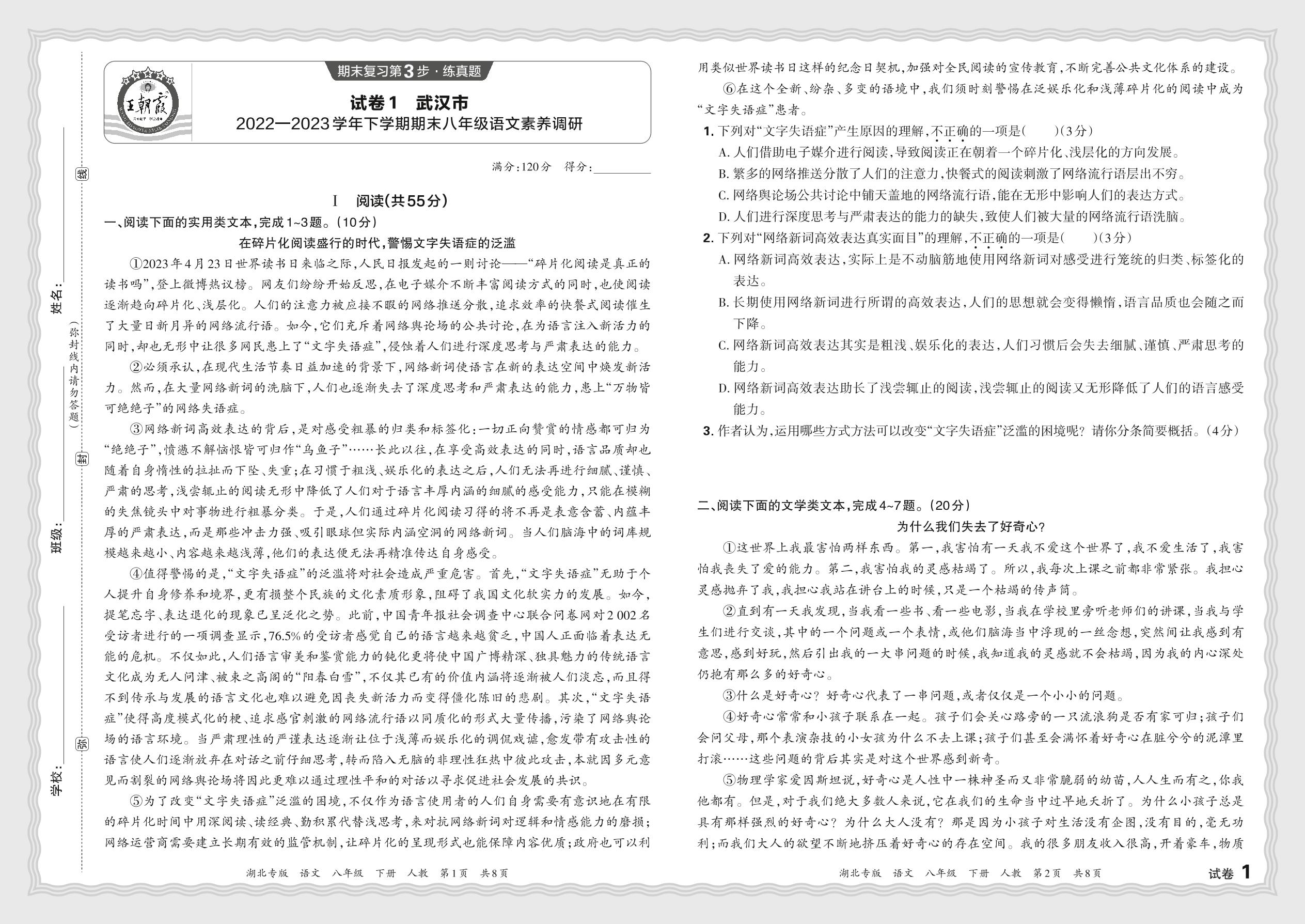 湖北省武汉市2022-2023学年下学期期末八年级语文素养调研(人教版)【1】