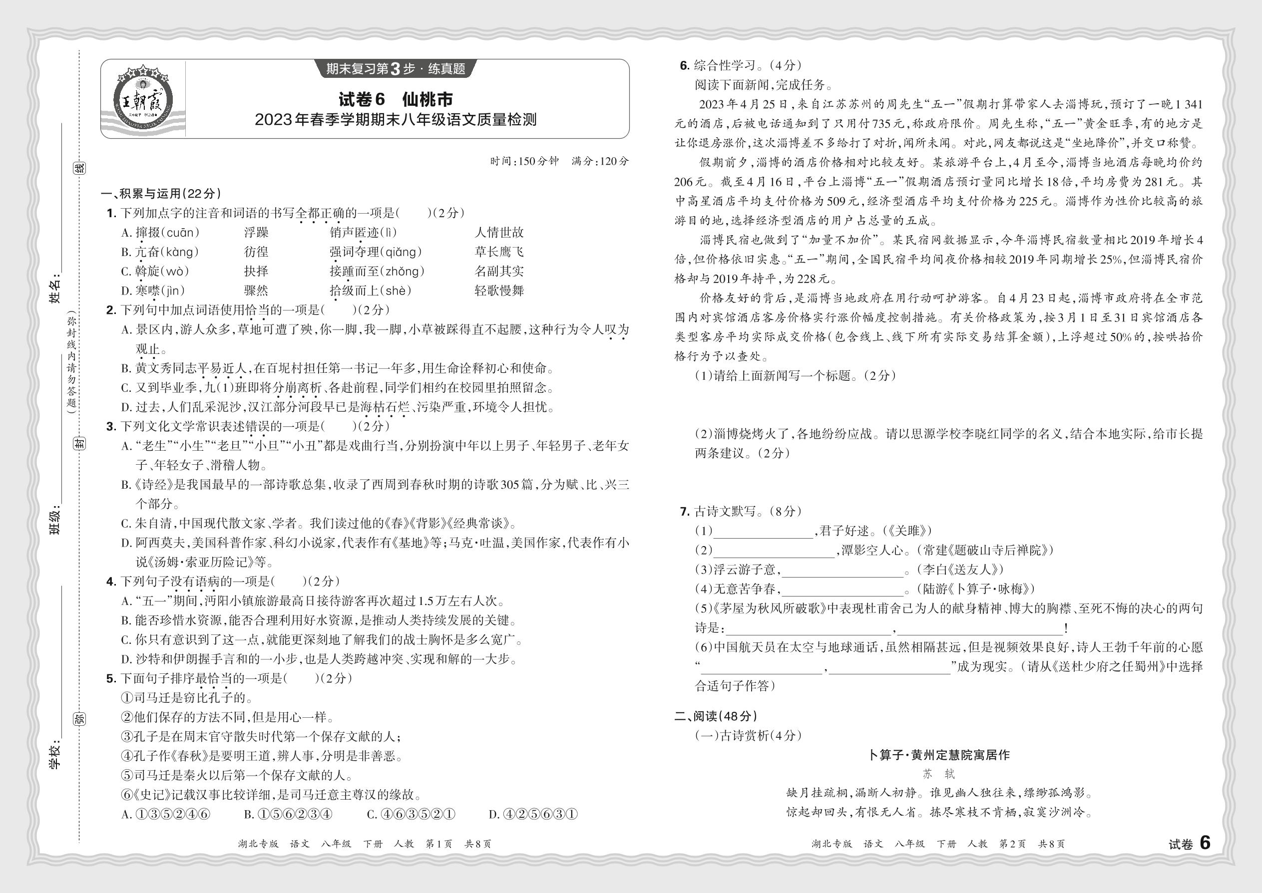 湖北省仙桃市2023年春季学期期末八年级语文质量检测(人教版)【6】