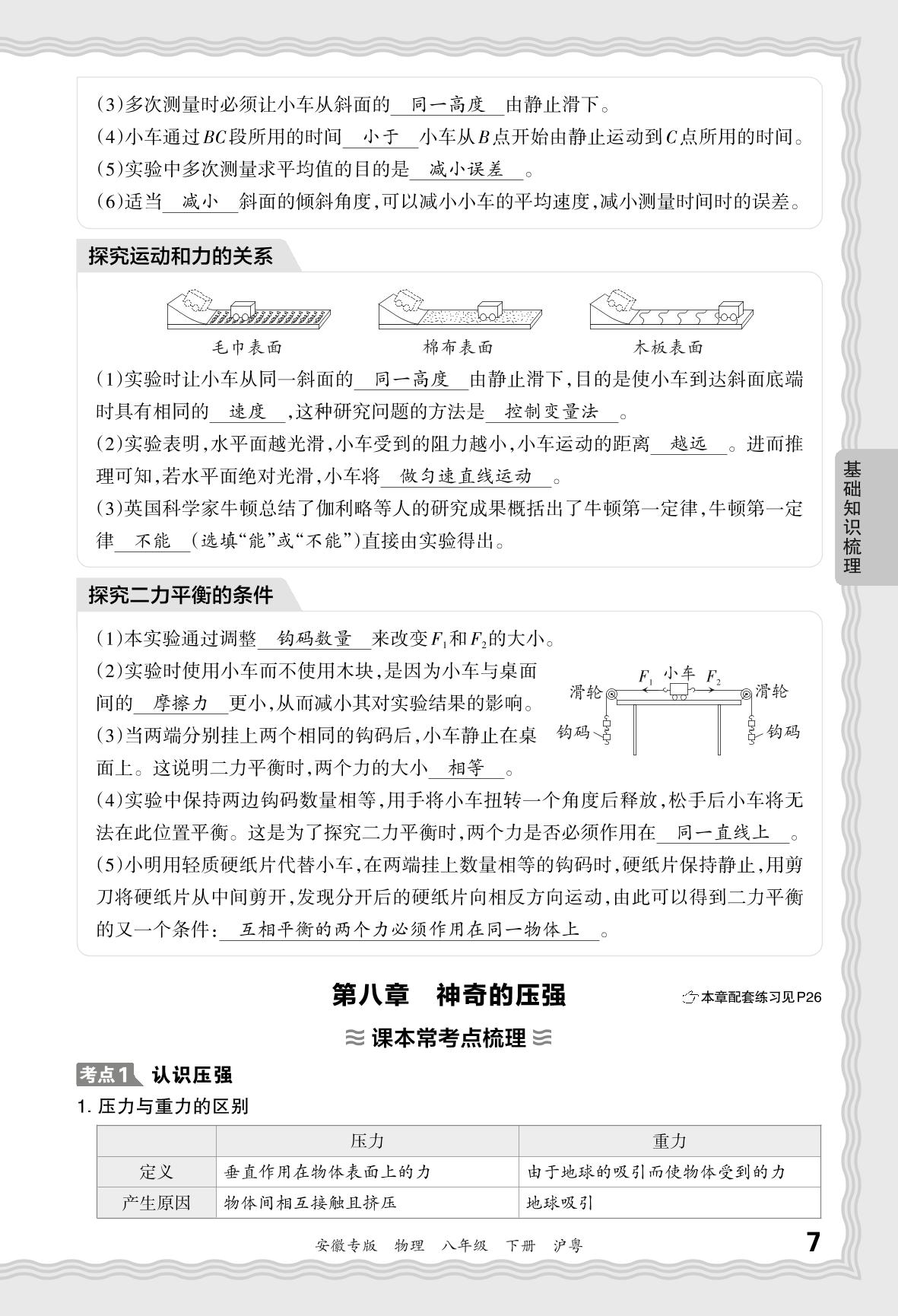 2024春下册八年级物理沪粤版 期末过课本安徽版·基础知识梳理 第八章 神奇的压强