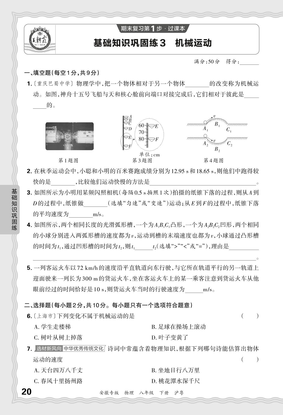 2024春下册八年级物理沪粤版 期末过课本安徽版·基础知识巩固练 机械运动【3】