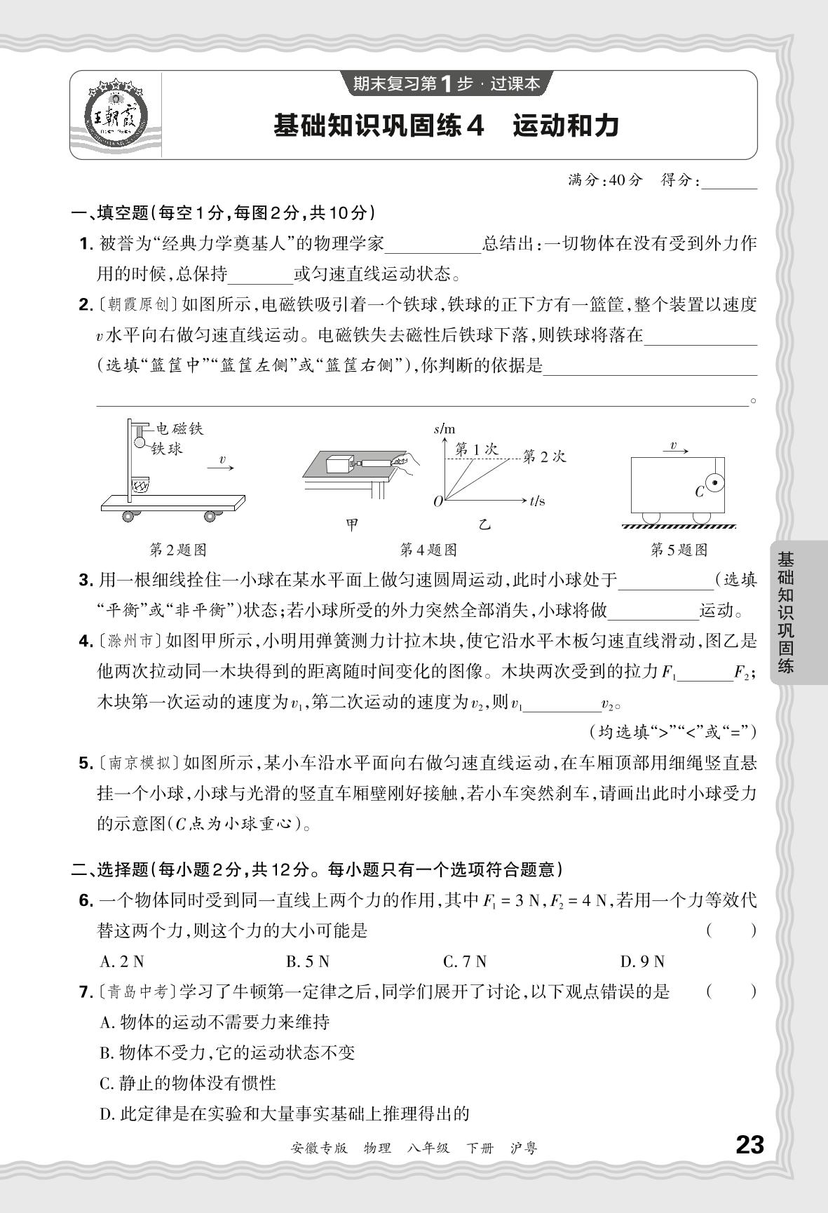 2024春下册八年级物理沪粤版 期末过课本安徽版·基础知识巩固练 运动和力【4】