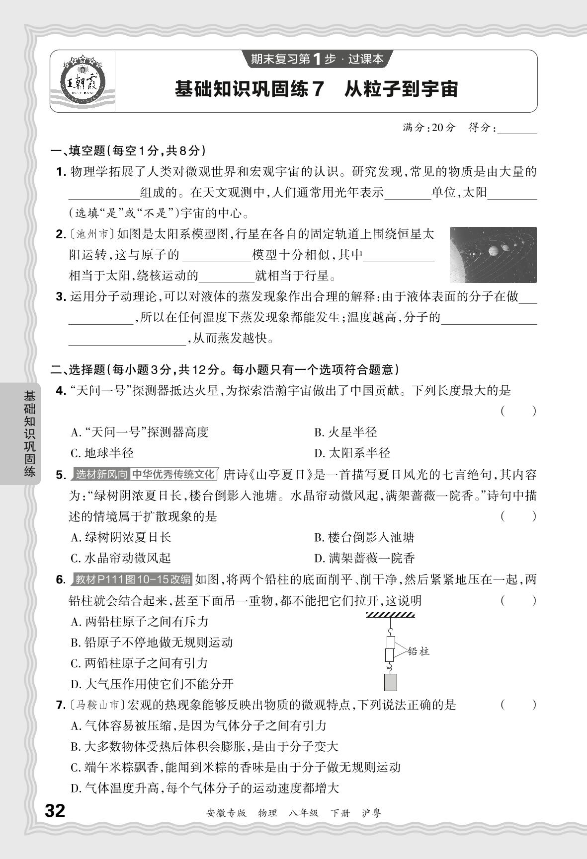 2024春下册八年级物理沪粤版 期末过课本安徽版·基础知识巩固练 从粒子到宇宙【7】