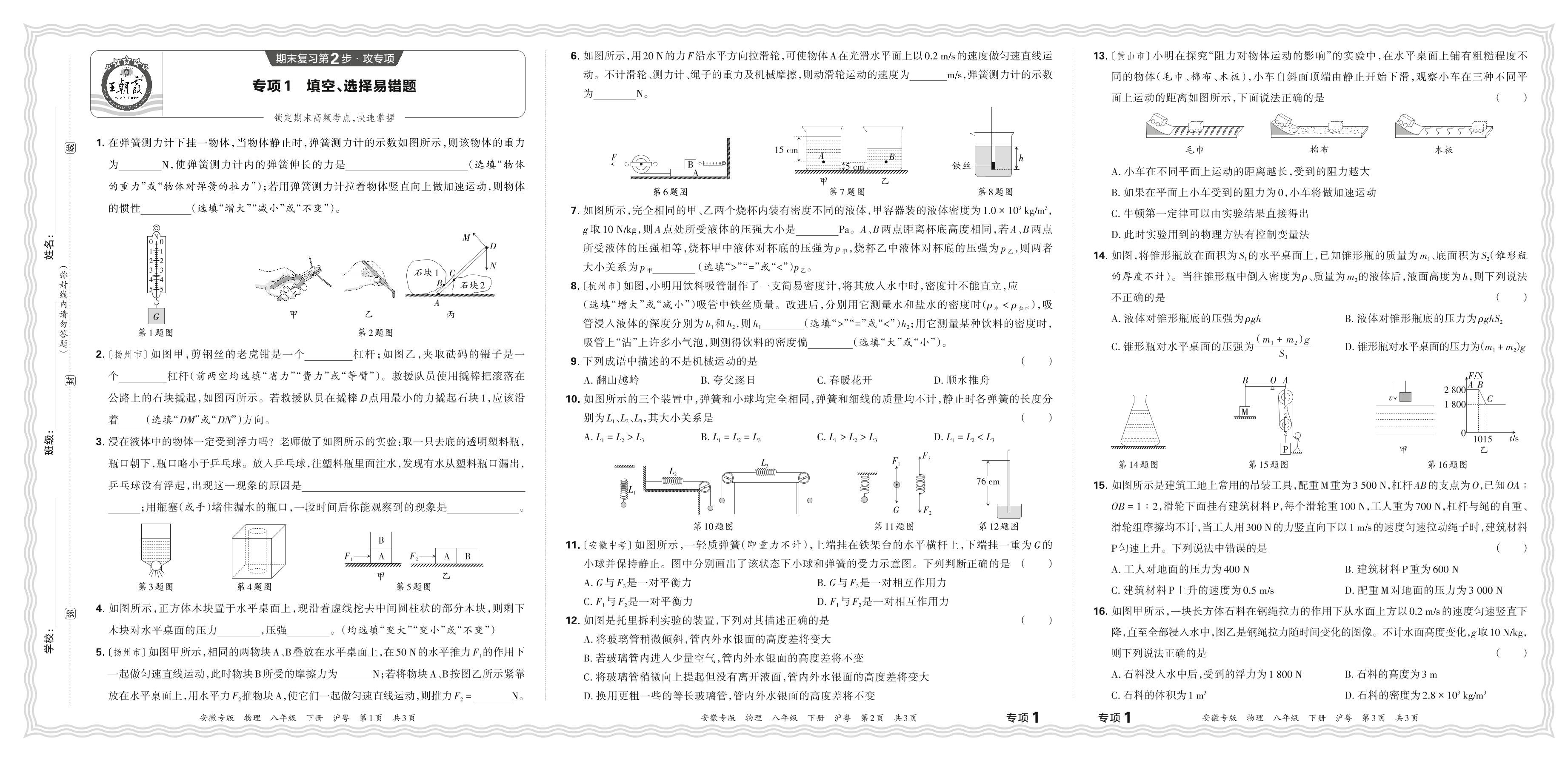 2024春下册八年级物理沪粤版 期末专项卷安徽版·填空、选择易错题【1】