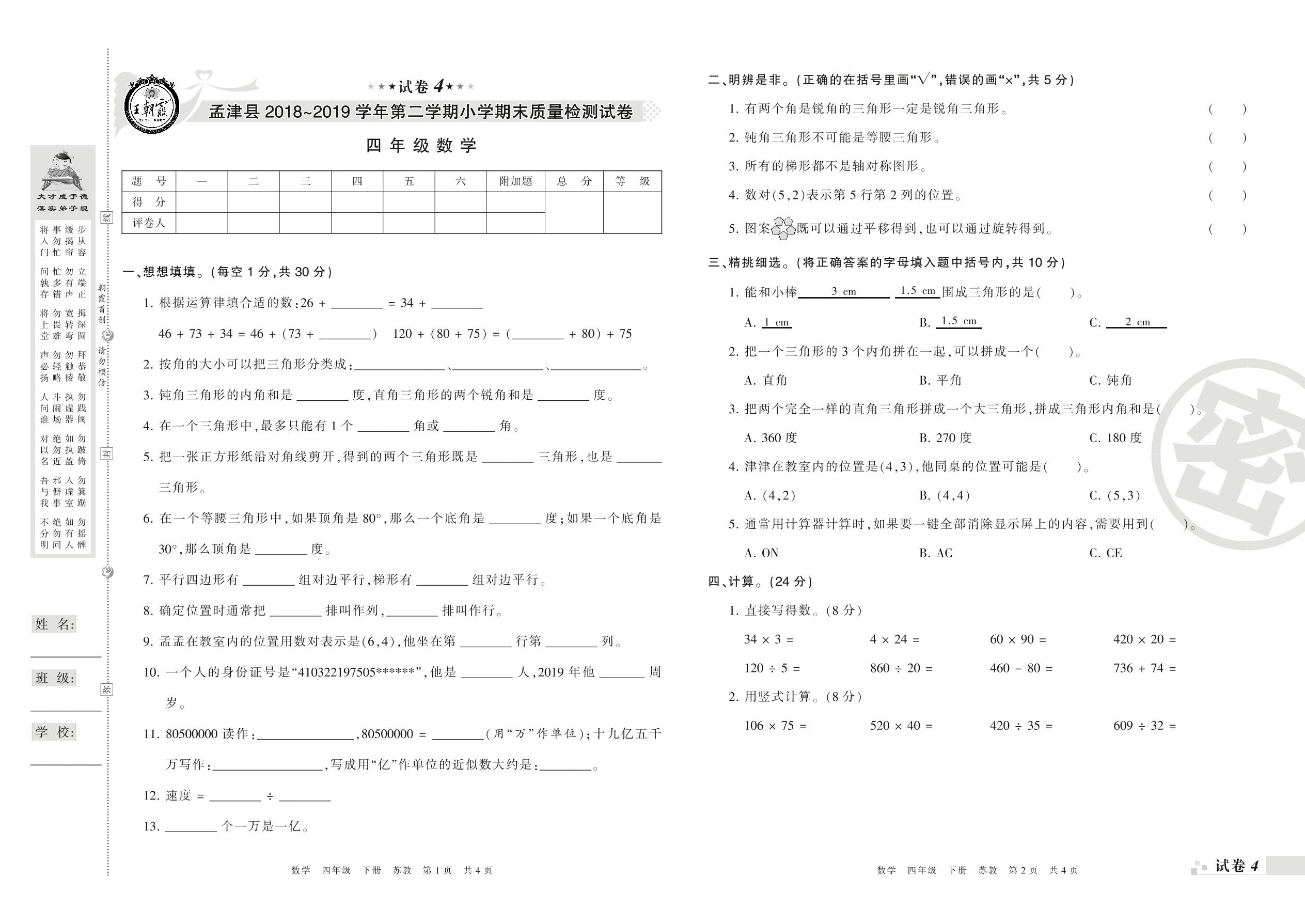 2018-2019学年第二学期洛阳市孟津县四年级数学试卷(苏教版)【4】