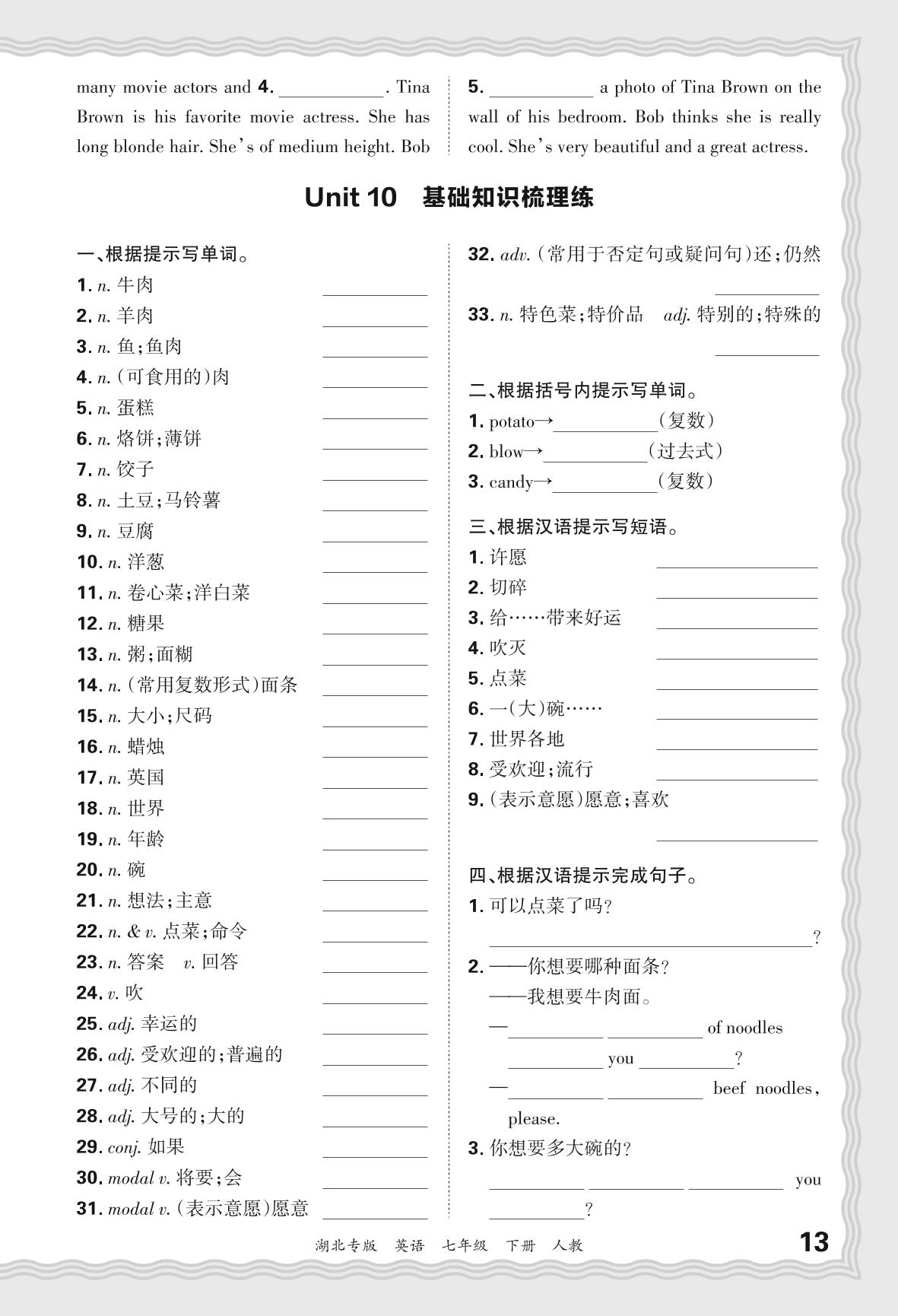 2024春下册七年级英语人教版 期末过课本湖北版·Unit 10 基础知识梳理练