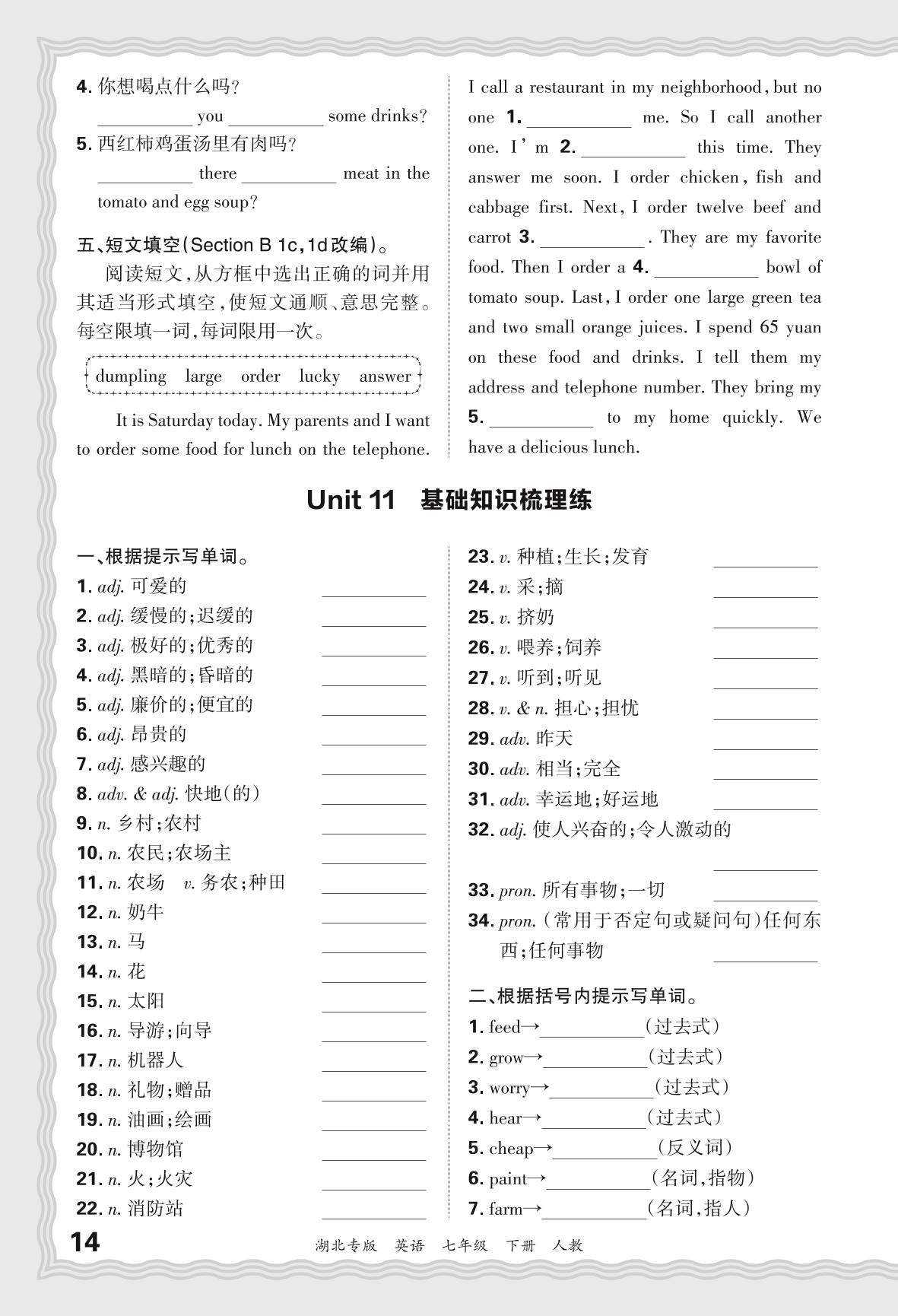 2024春下册七年级英语人教版 期末过课本湖北版·Unit 11 基础知识梳理练