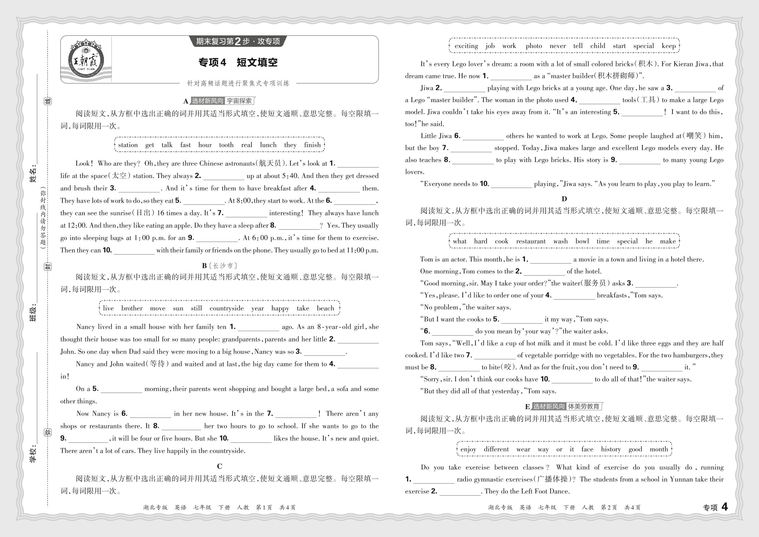2024春下册七年级英语人教版 期末专项卷湖北版·短文填空【4】