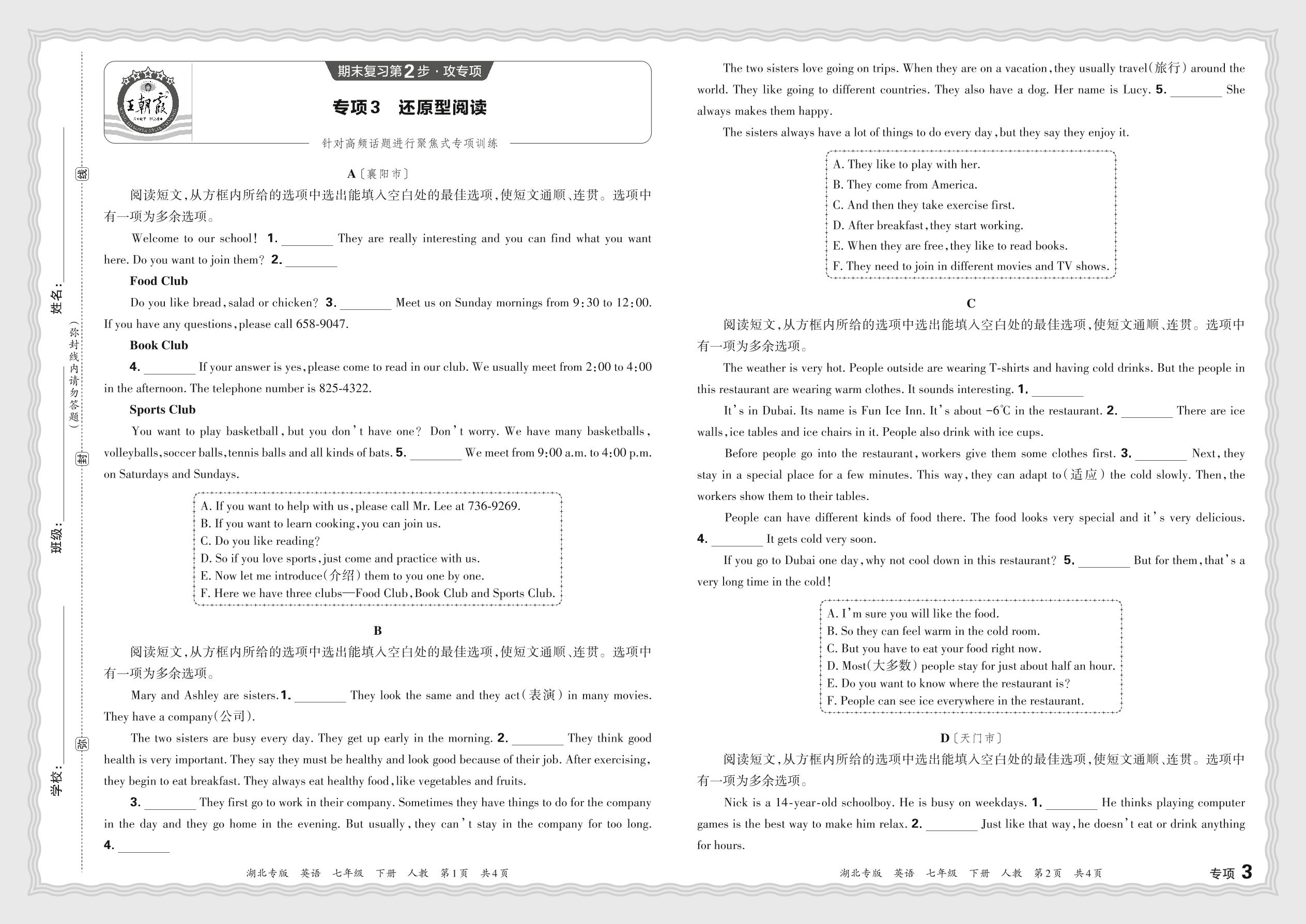 2024春下册七年级英语人教版 期末专项卷湖北版·还原型阅读【3】