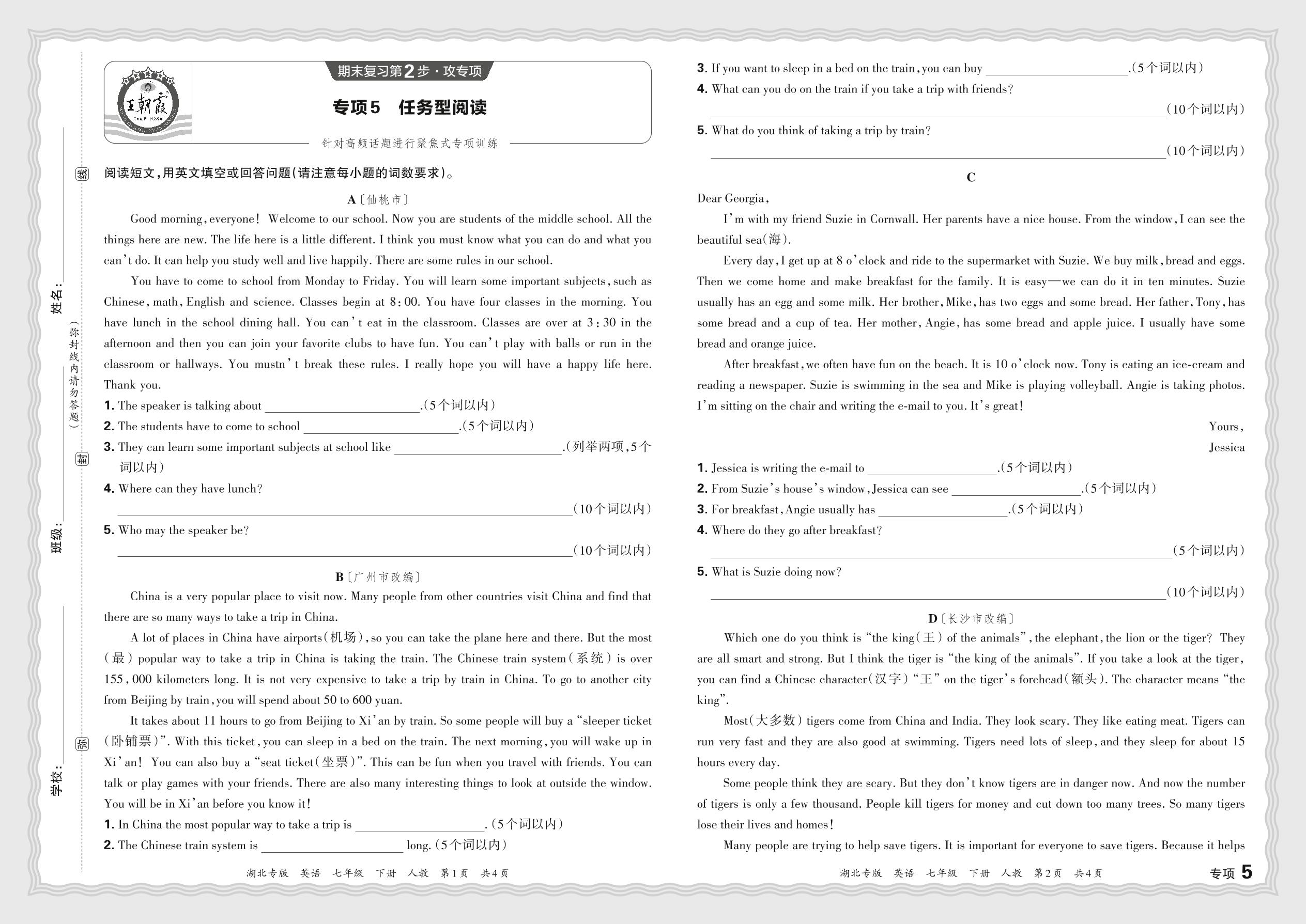 2024春下册七年级英语人教版 期末专项卷湖北版·任务型阅读【5】