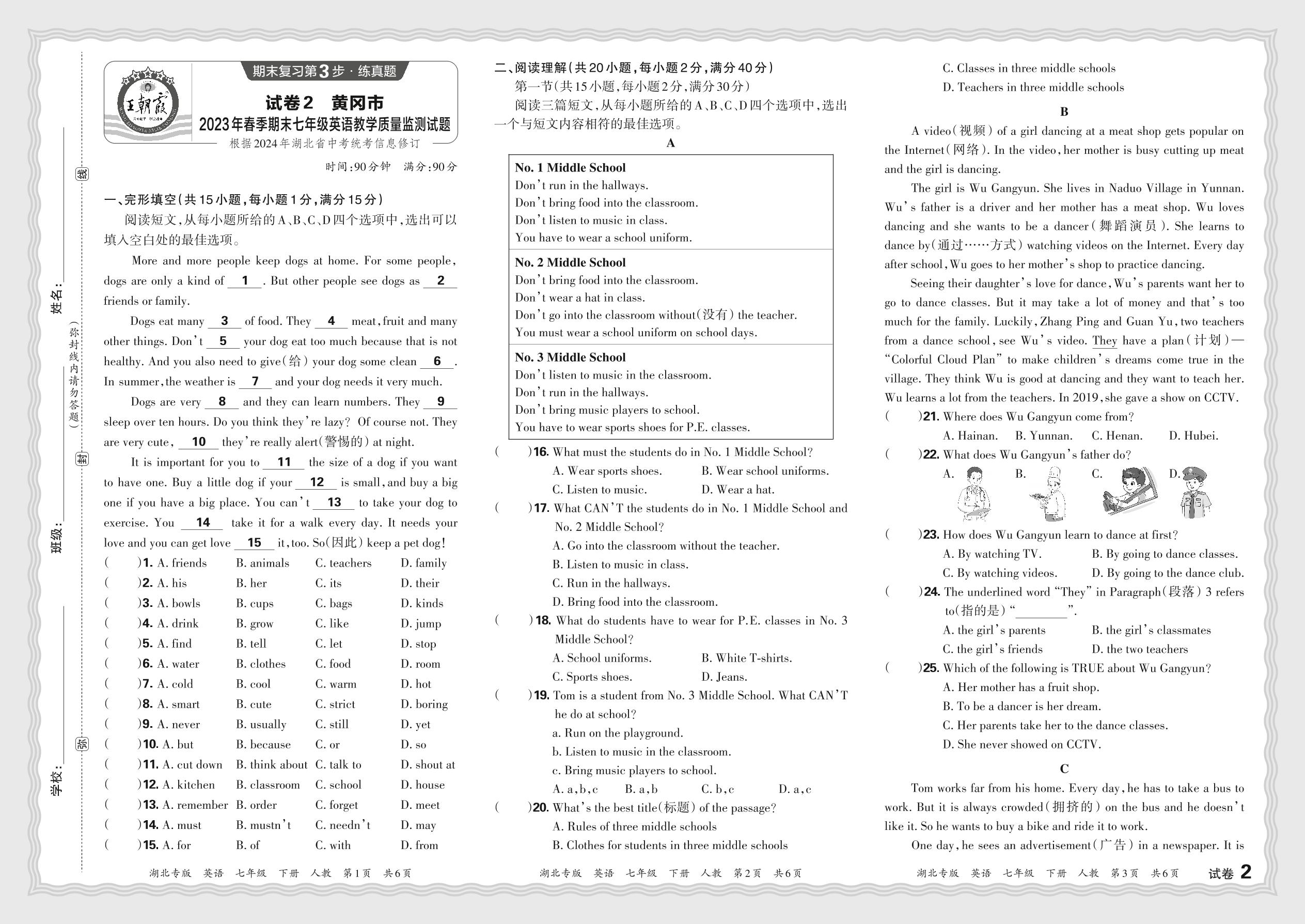 湖北省黄冈市2023年春季期末七年级英语教学质量监测试题(人教版)【2】