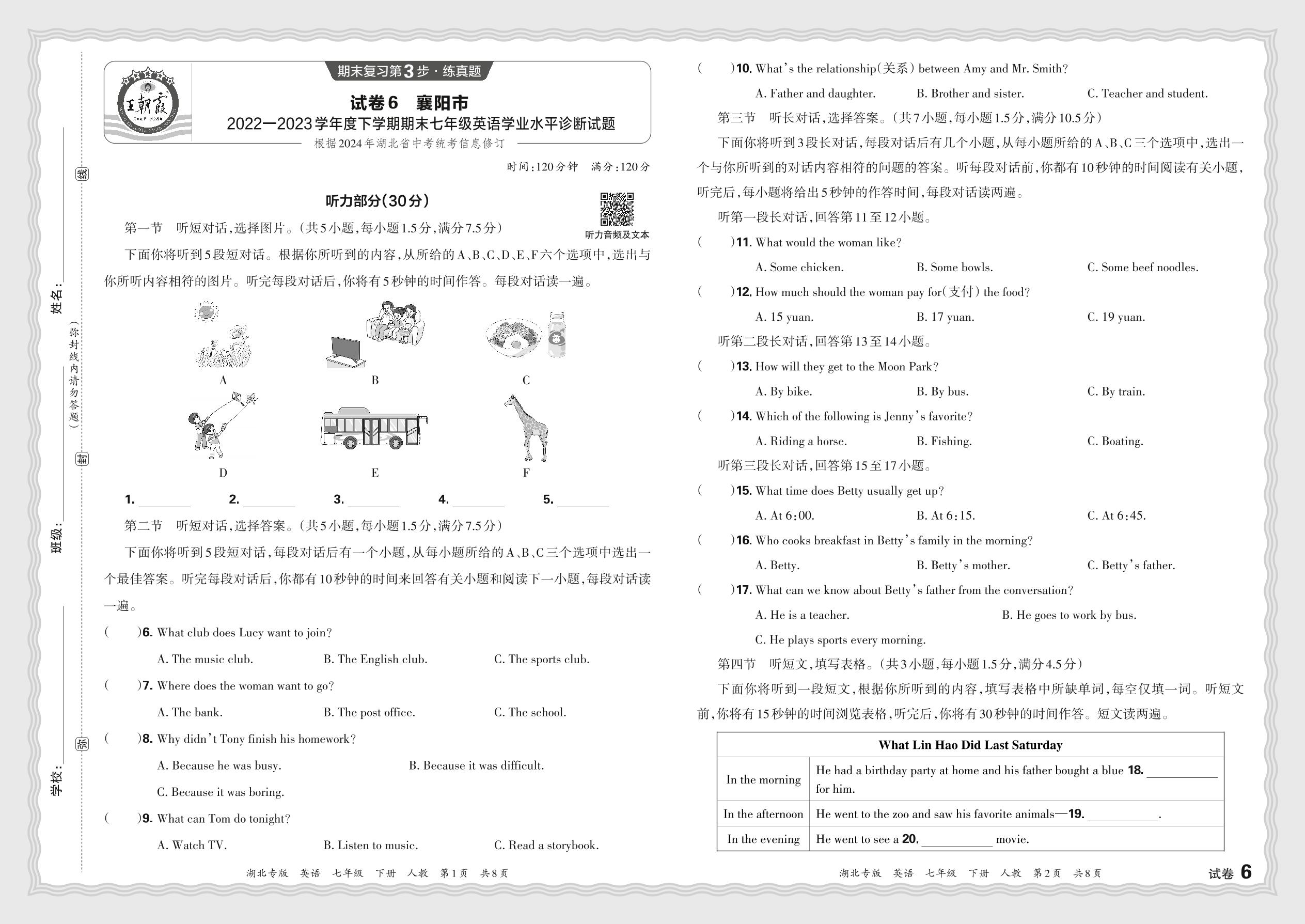 湖北省襄阳市2022-2023学年度下学期期末七年级英语学业水平诊断试题(人教版)【6】