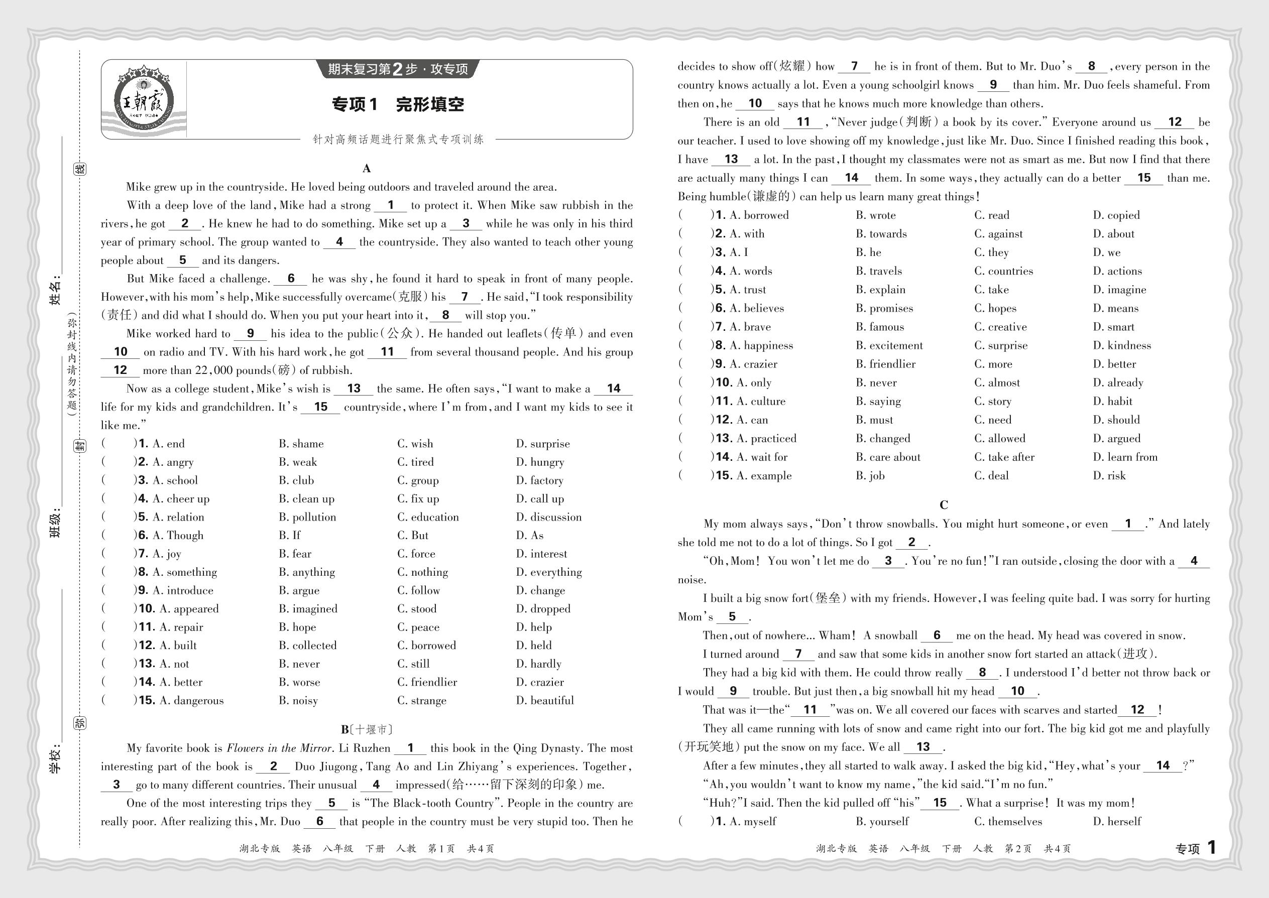 2024春下册八年级英语人教版 期末专项卷湖北版·完形填空【1】