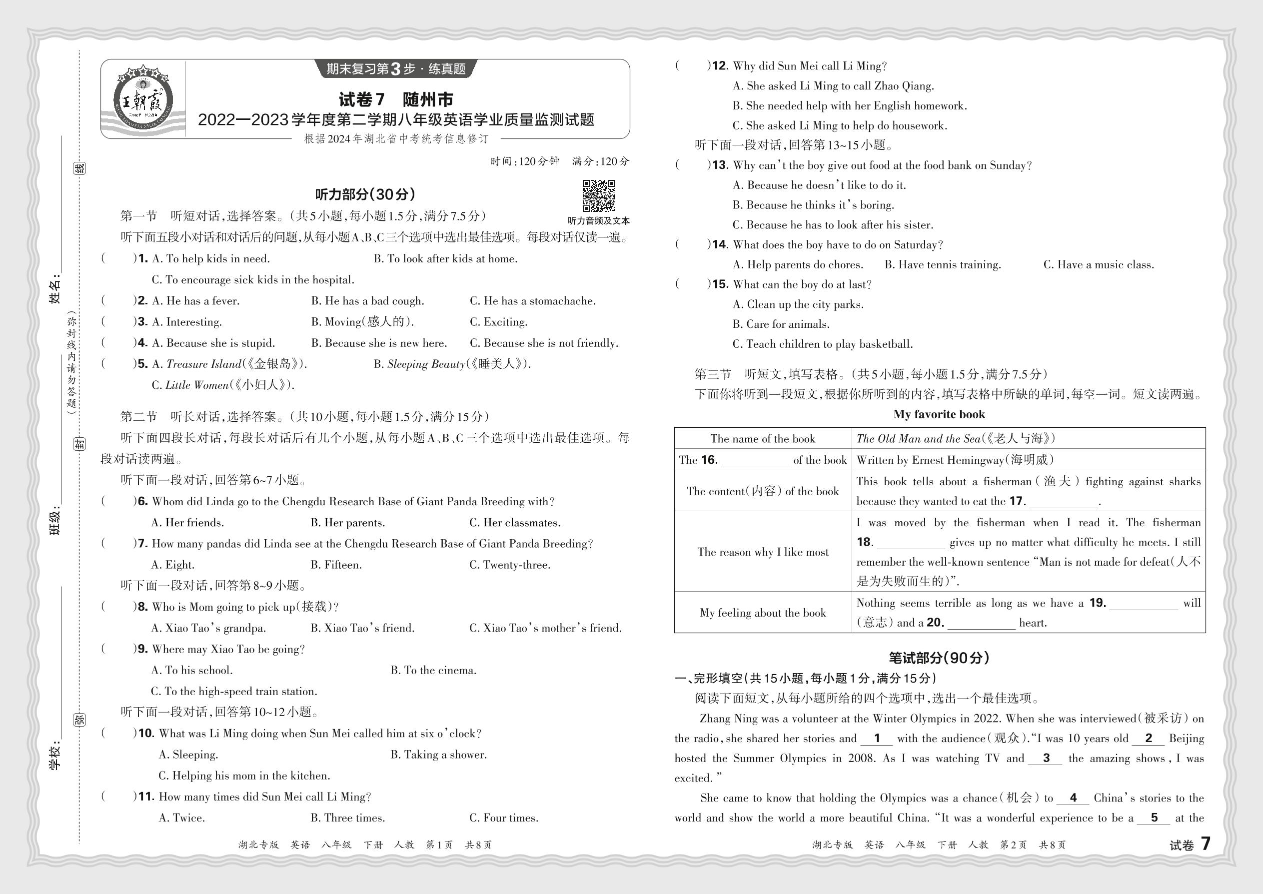 湖北省随州市2022-2023学年度第二学期八年级英语学业质量监测试题(人教版)【7】