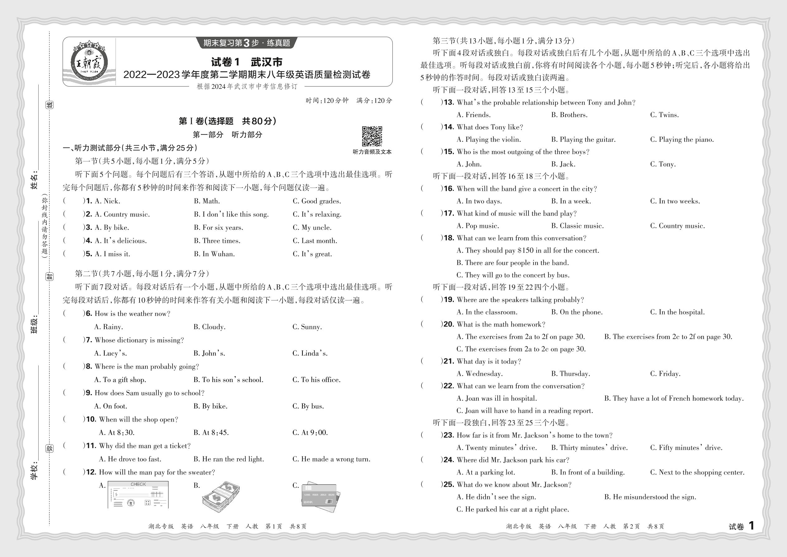 湖北省武汉市2022-2023学年度第二学期期末八年级英语质量检测试卷(人教版)【1】