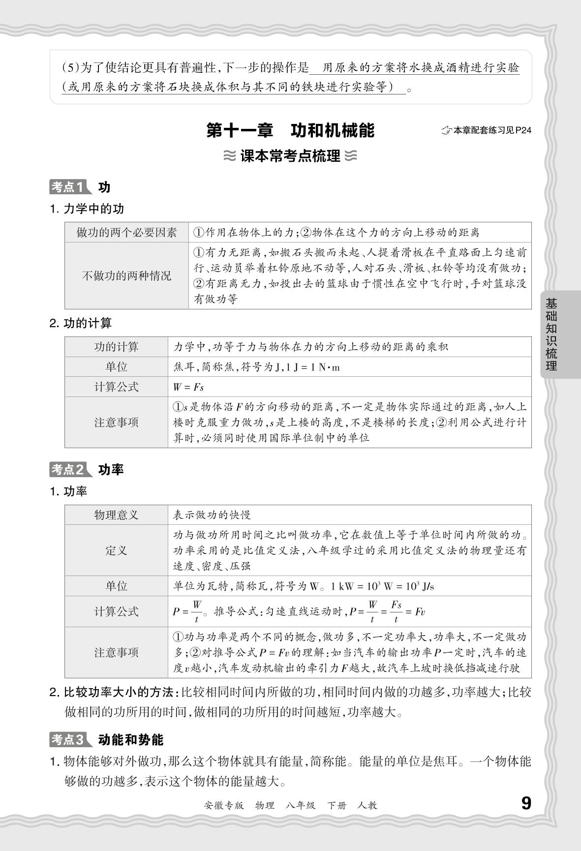 2024春下册八年级物理人教版 期末过课本安徽版·基础知识梳理 第十一章 功和机械能