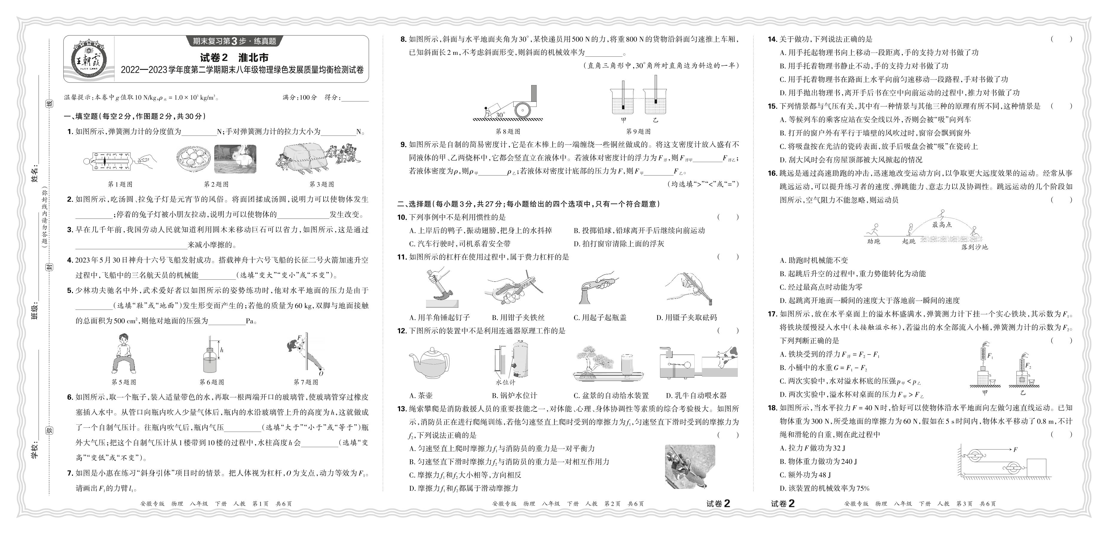 安徽省淮北市2022-2023学年度第二学期期末八年级物理绿色发展质量均衡检测试卷(人教版)【2】