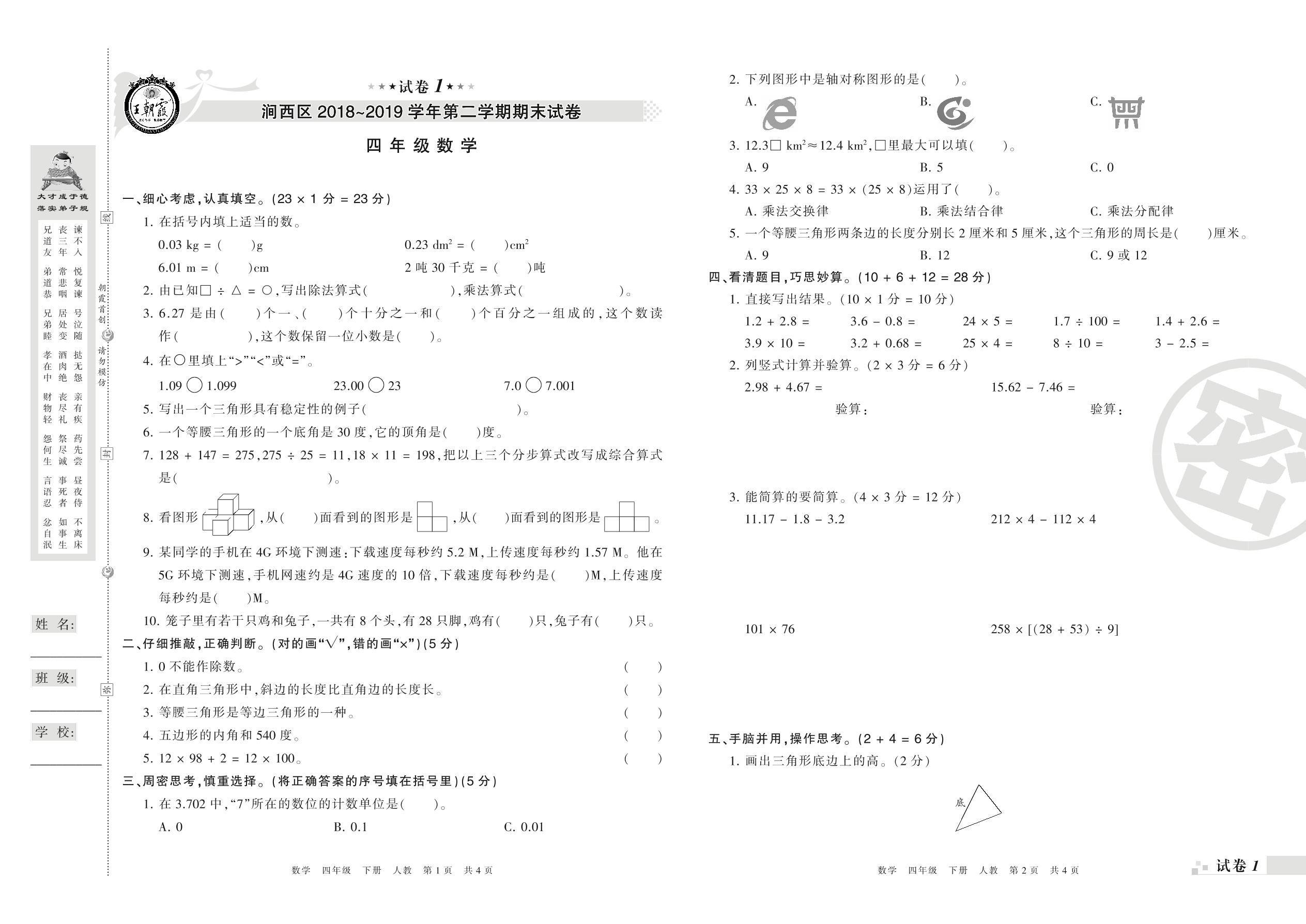 2018-2019学年第二学期洛阳市涧西区四年级数学试卷(人教版)【1】