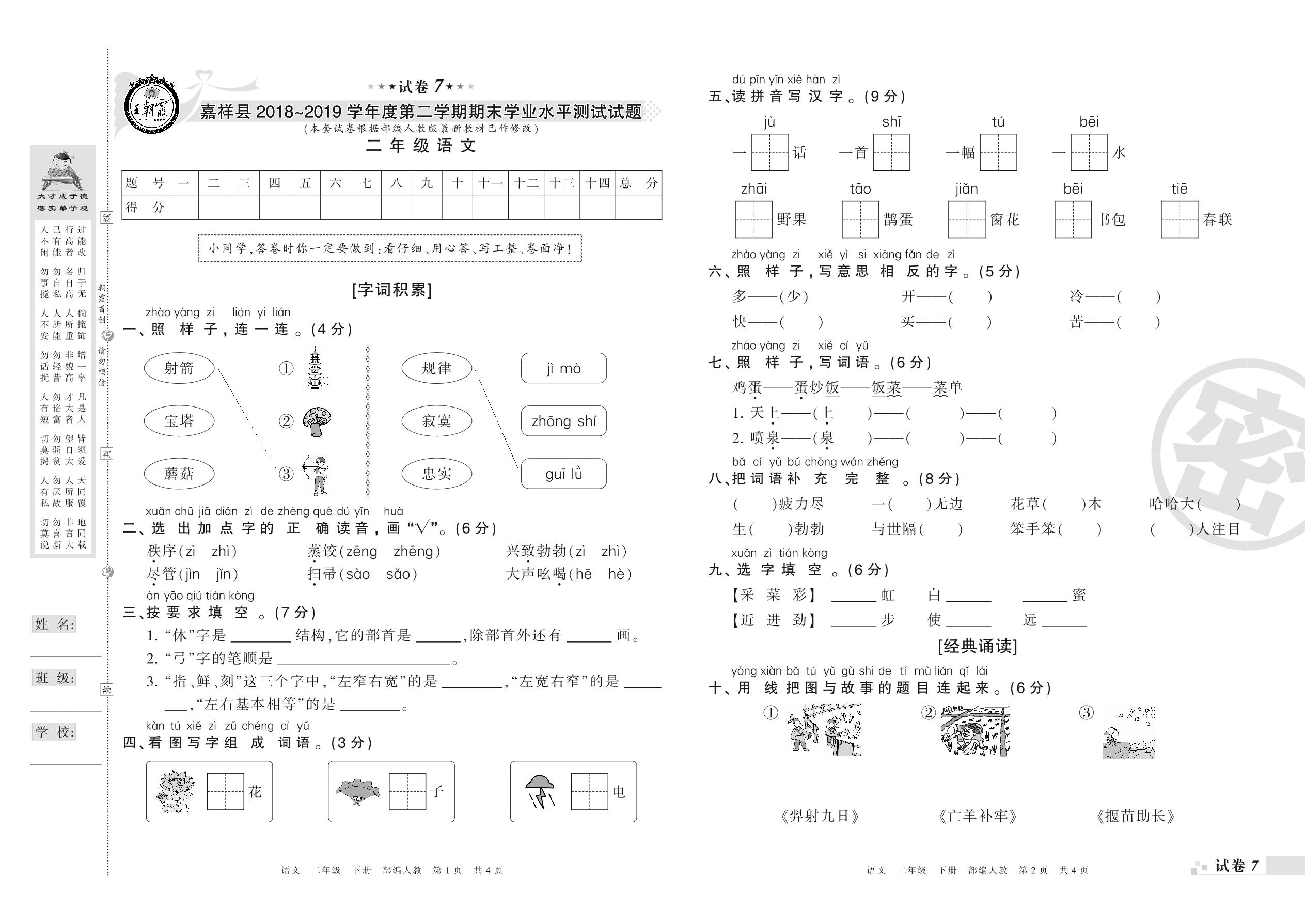 2018-2019学年第二学期济宁市嘉祥县二年级语文试卷(人教版)【7】