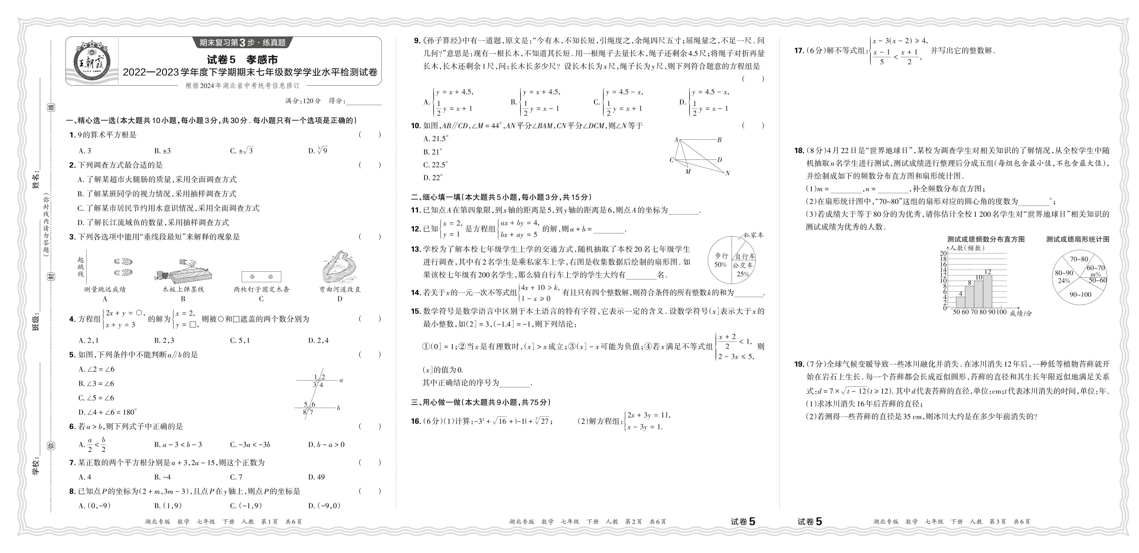 湖北省孝感市2022-2023学年度下学期期末七年级数学学业水平检测试卷(人教版)【5】