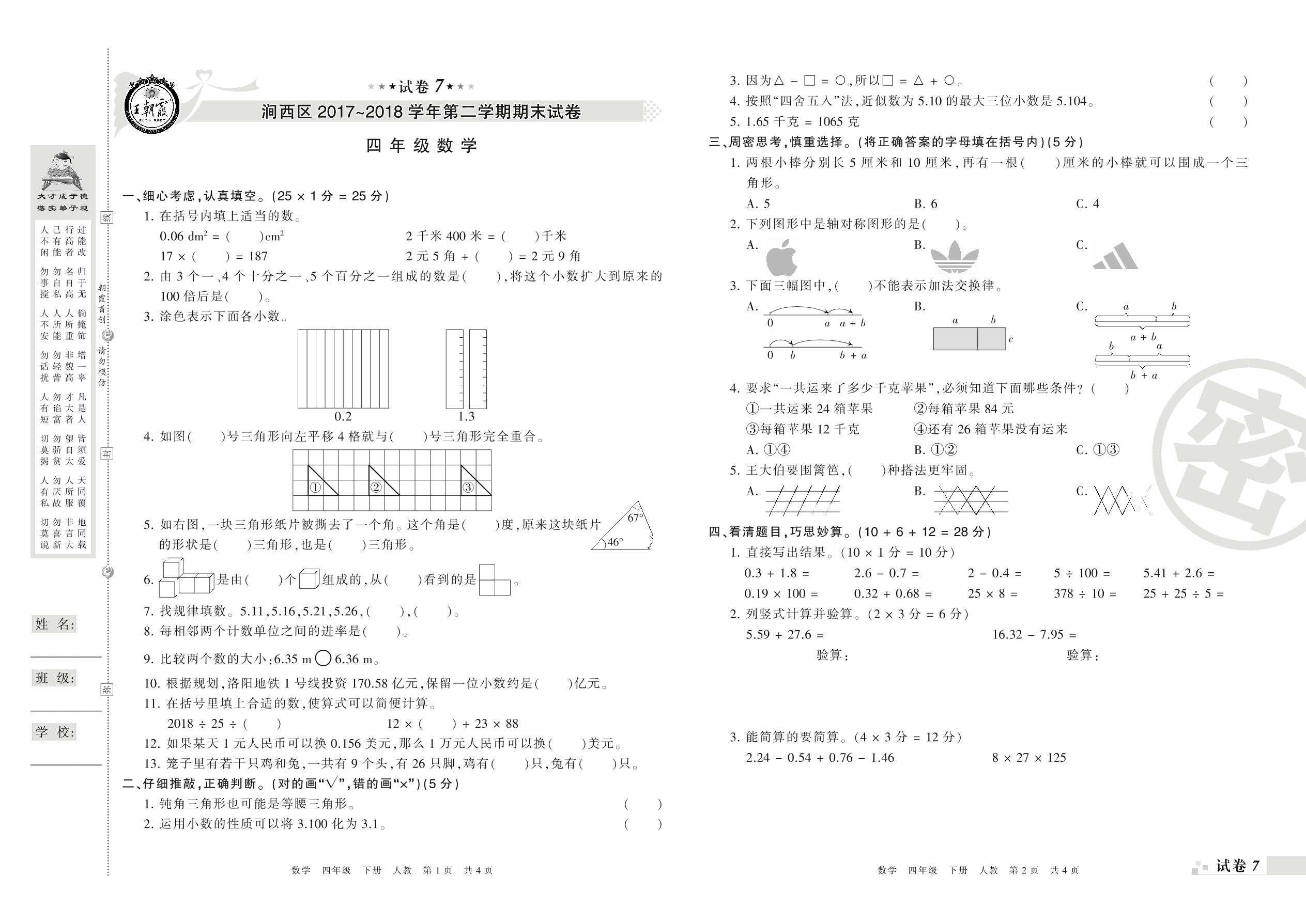 2017-2018学年第二学期洛阳市涧西区四年级数学试卷(人教版)【7】