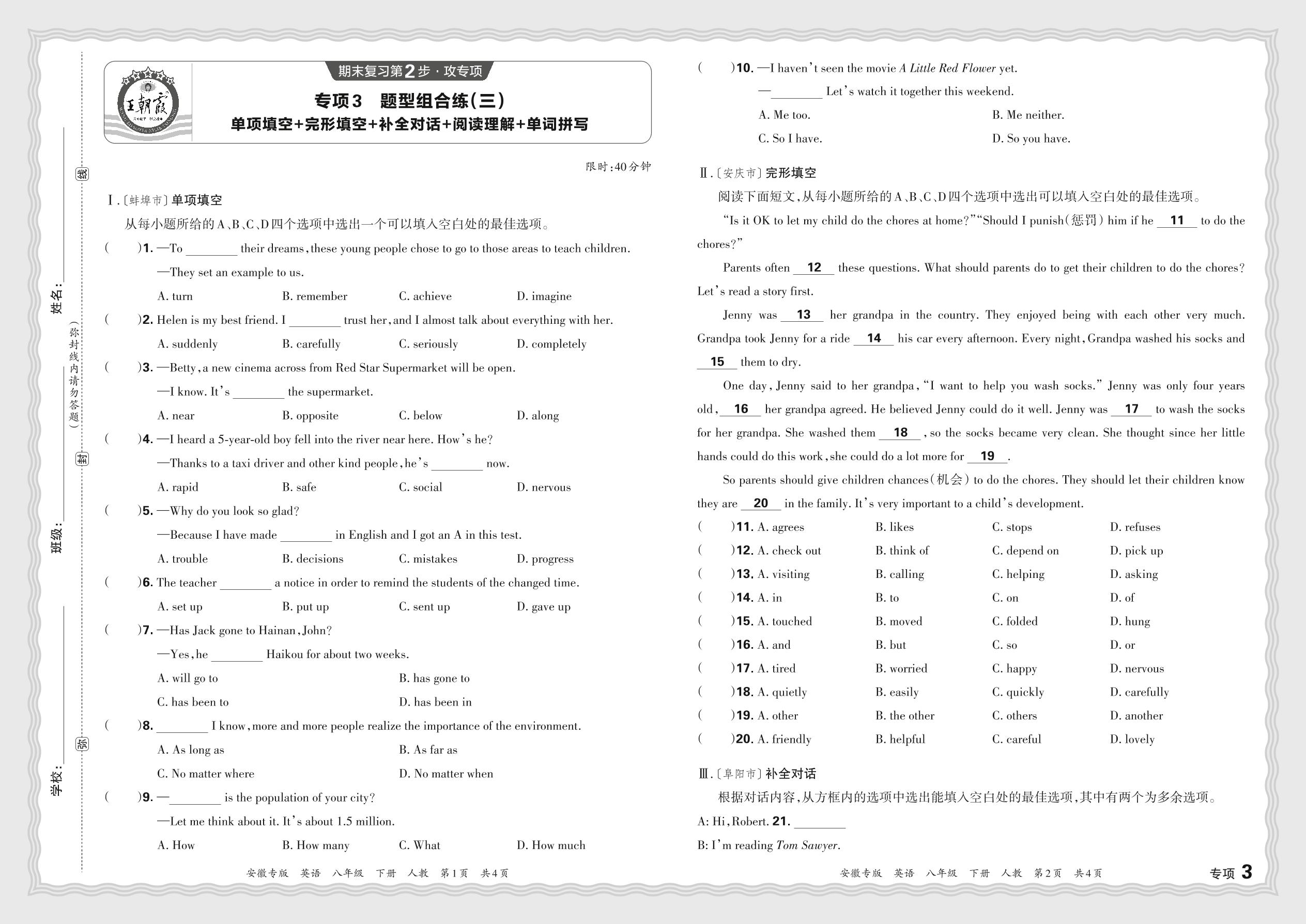 2024春下册八年级英语人教版 期末专项卷安徽版·题型组合练(三)