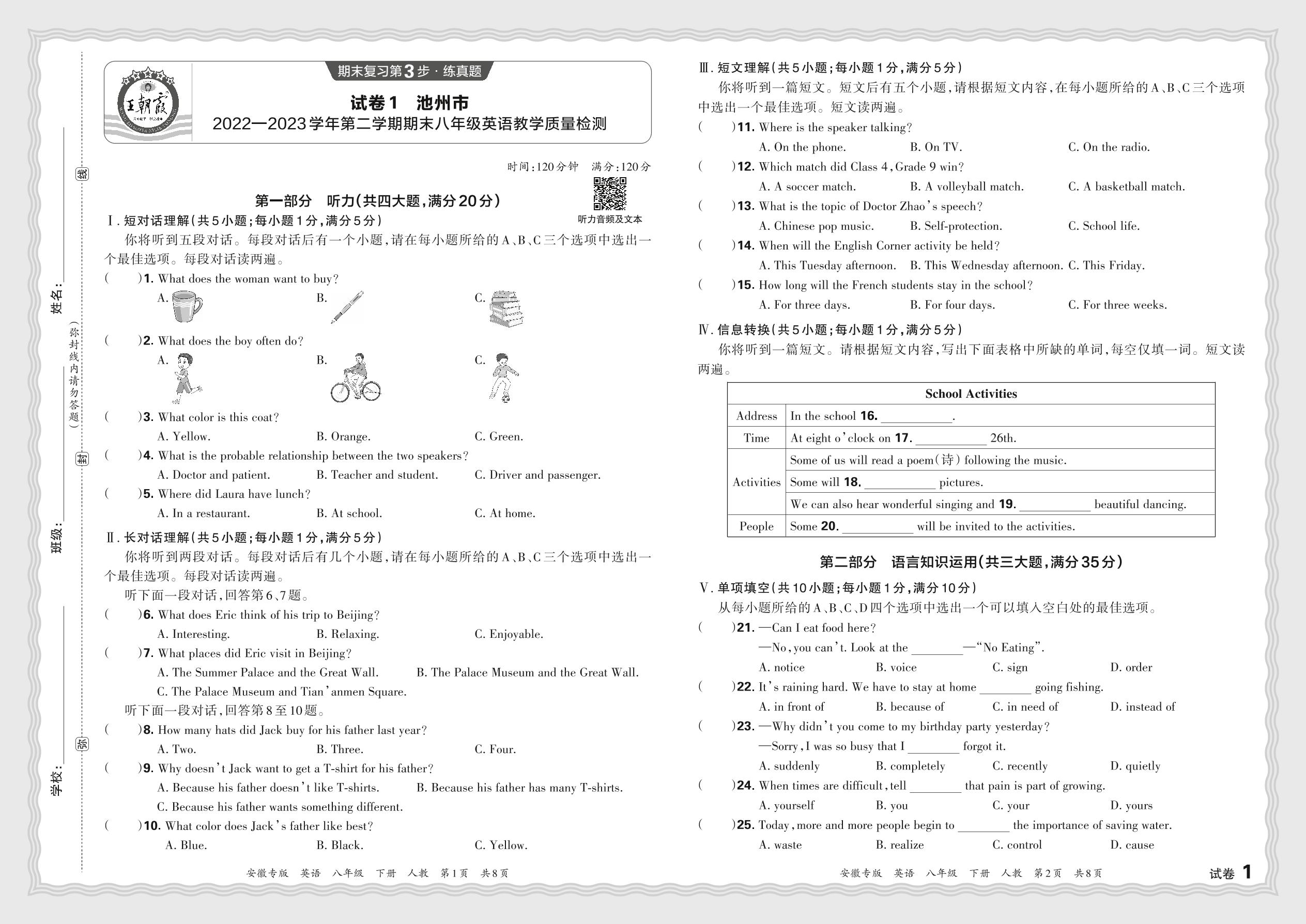 安徽省池州市2022-2023学年第二学期期末八年级英语教学质量检测(人教版)【1】