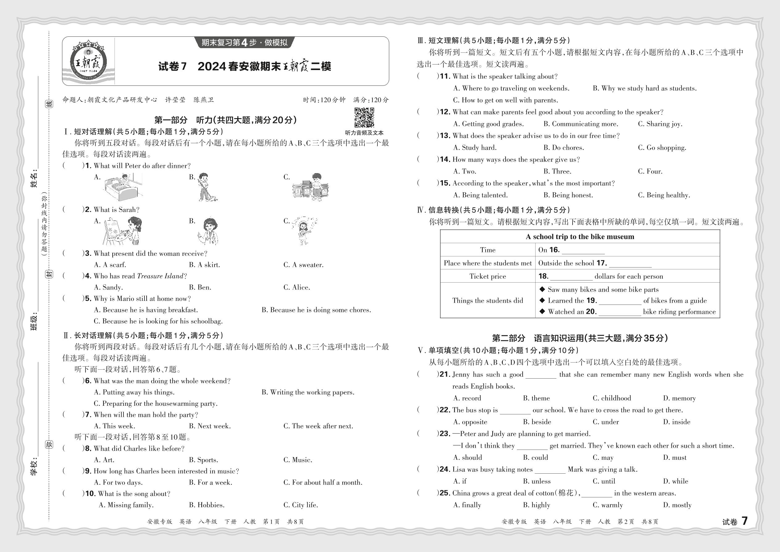 2024春下册八年级英语人教版 安徽期末王朝霞二模