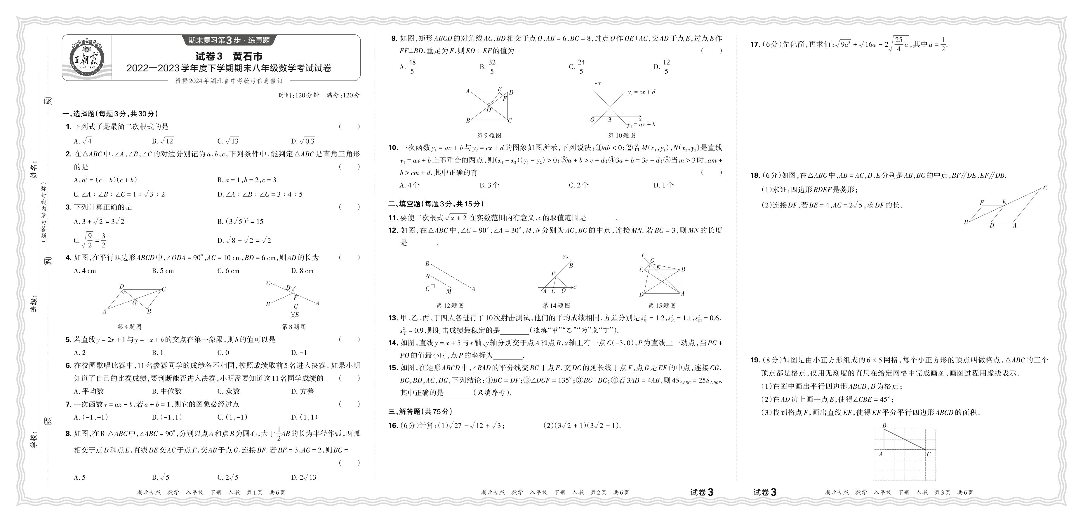 湖北省黄石市2022-2023学年度下学期期末八年级数学考试试卷(人教版)【3】