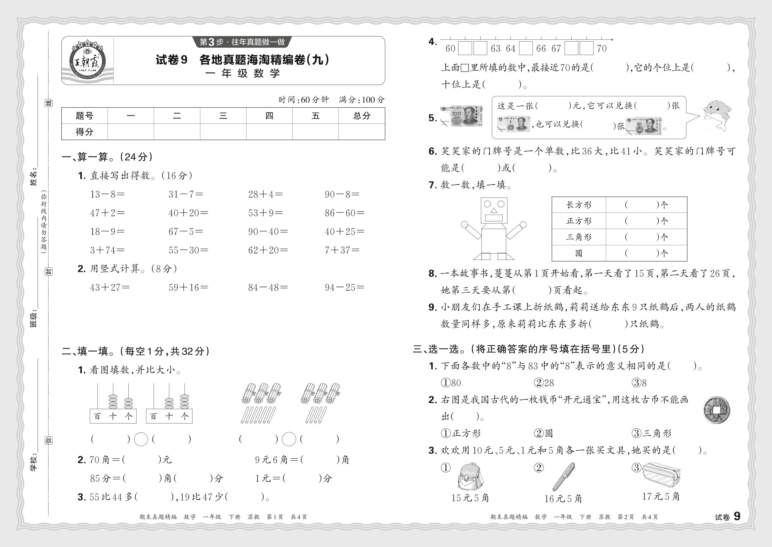 2024春下册一年级数学苏教版 各地真题海淘精编卷(九)JB